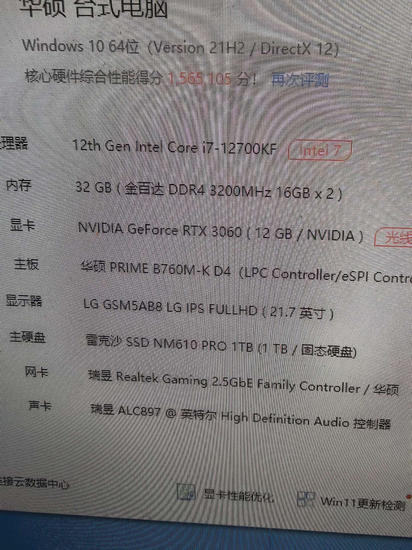cpu和主板是二手的,在保 其他都是全新配件 质保全 酷睿12代i7 12700kf cpu 华硕b760m主板 金百达d4 3200 16x2 32G内存 雷克沙1T nvme固态硬盘 盈通rtx3060 12G独立显卡 黑石塔额定500W电源 海景房机箱