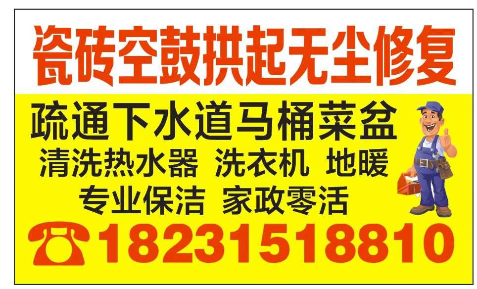 专业瓷砖空鼓修复,疏通下水道,马桶菜盆及安装维修,专业保洁,清洗热水器洗衣机地暖18231518810