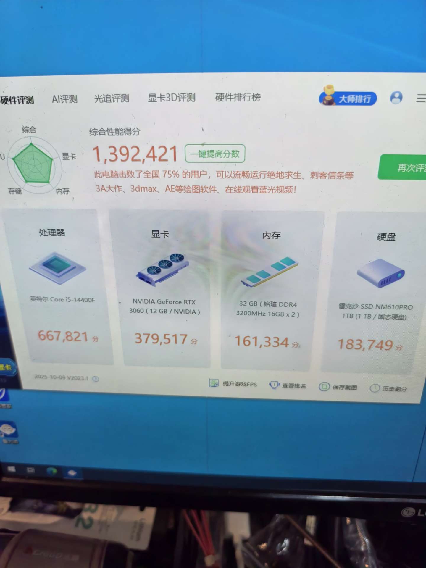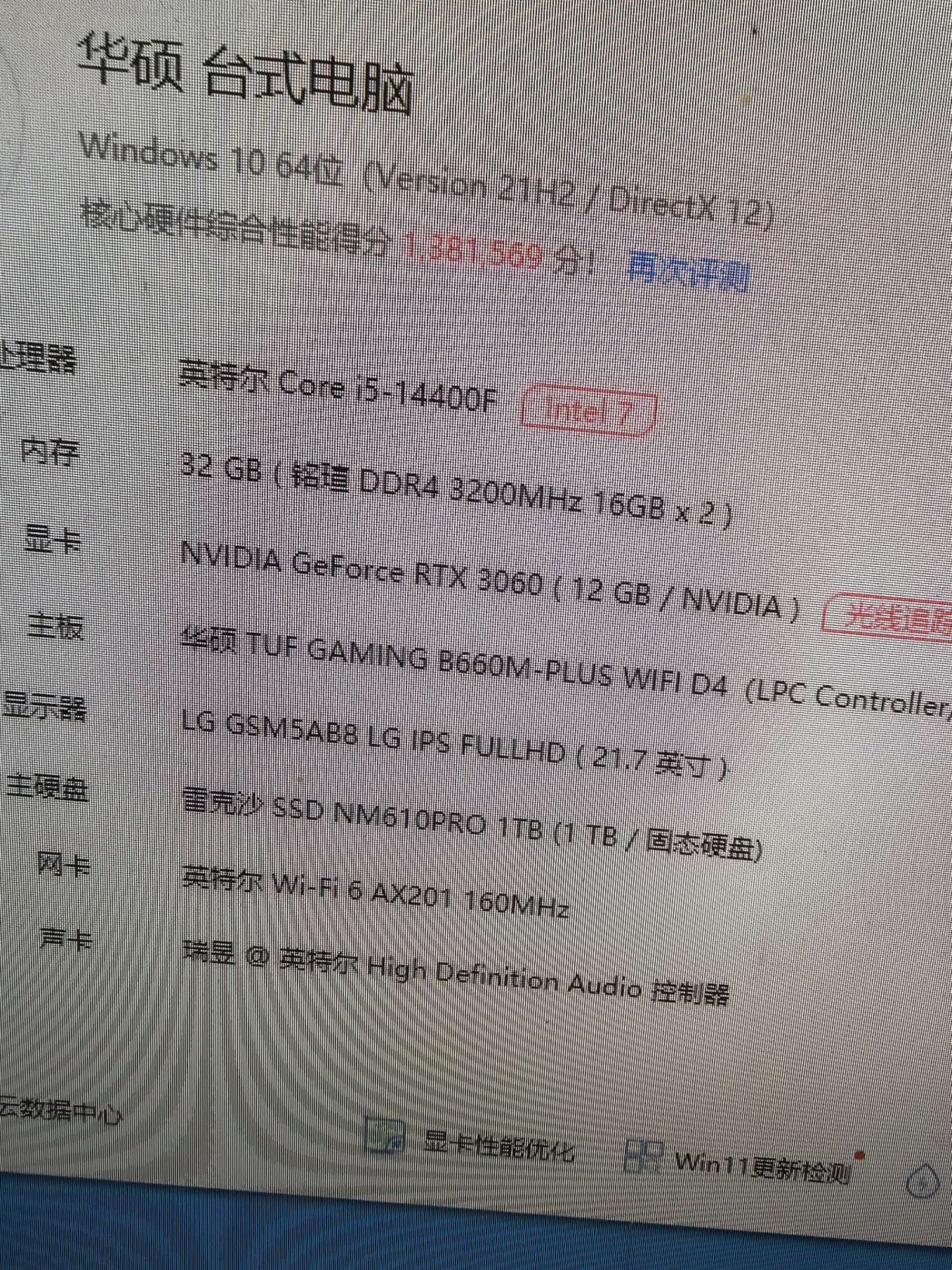 主板是二手的,其他都是全新配件 整机在保 酷睿14代i5 14400f cpu 华硕tuf b660m wifi主板 铭瑄d4 3200 16x2 32G内存 雷克沙1T nvme固态硬盘 盈通rtx3060 12G独立显卡 锐喜额定550W电源 海景房机箱