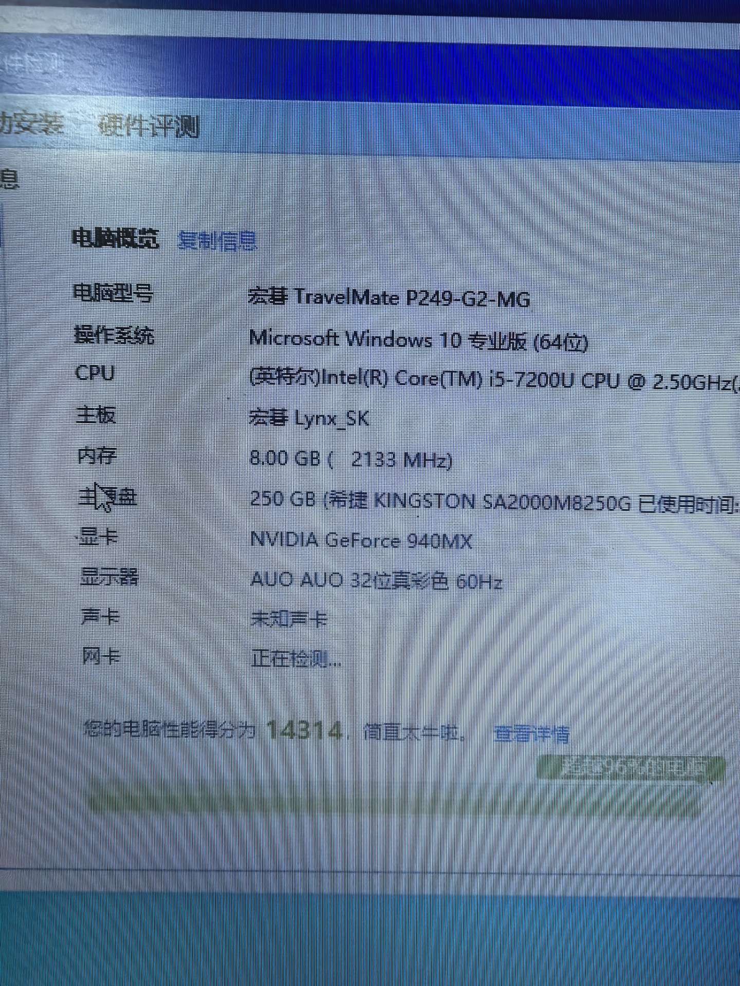 8成新 电池坏了 其他无问题 酷睿7代i5 7200u cpu 8G内存 250G固态硬盘 gt940mx 2G独立显卡 14寸屏 适合商务办公 高清影音 一般小游戏流畅运行