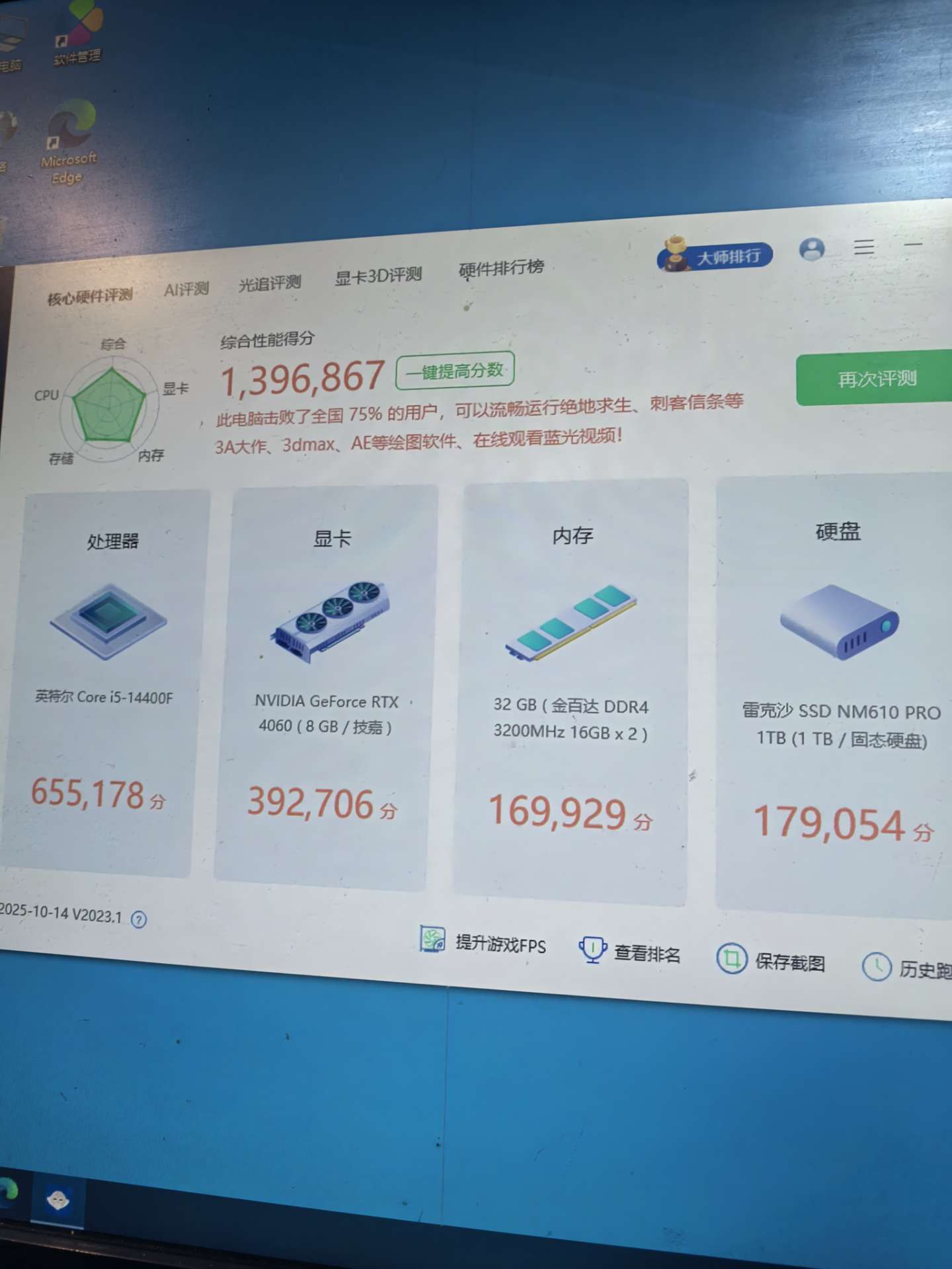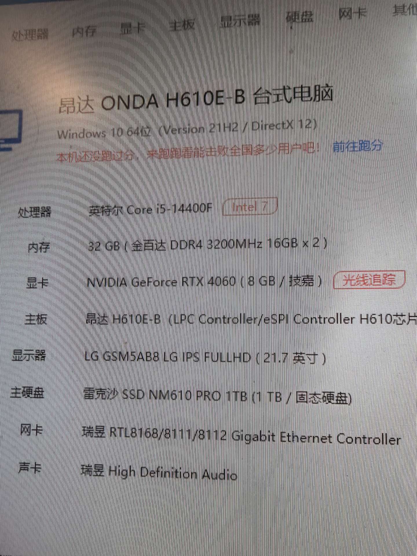 全新配件质保全 酷睿14代i5 14400f cpu 昂达h610m主板 金百达d4 3200 16x2 32G内存 雷克沙1T nvme固态硬盘 技嘉rtx4060 8G独立显卡 战斧t6 额定600W电源 海景房机箱