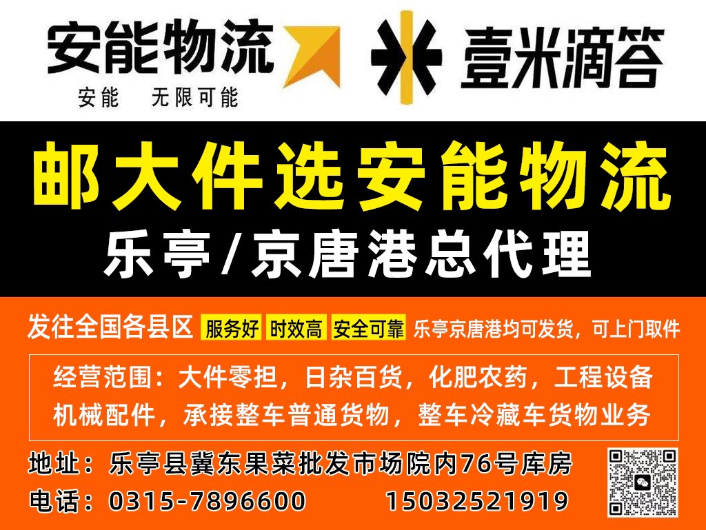 安能物流壹米滴答 乐亭/京唐港总代理 发往全国各县区,服务好,时效高,安全可靠,乐亭京唐港均可发货,可上门取件。 经营范围:大件零担,日杂百货,化肥农药,工程设备,机械配件,承接整车普通货物,整车冷藏车货物业务地址:乐亭县冀东果菜批发市场院内76号库房 电话 0315-7896600 15032521919;