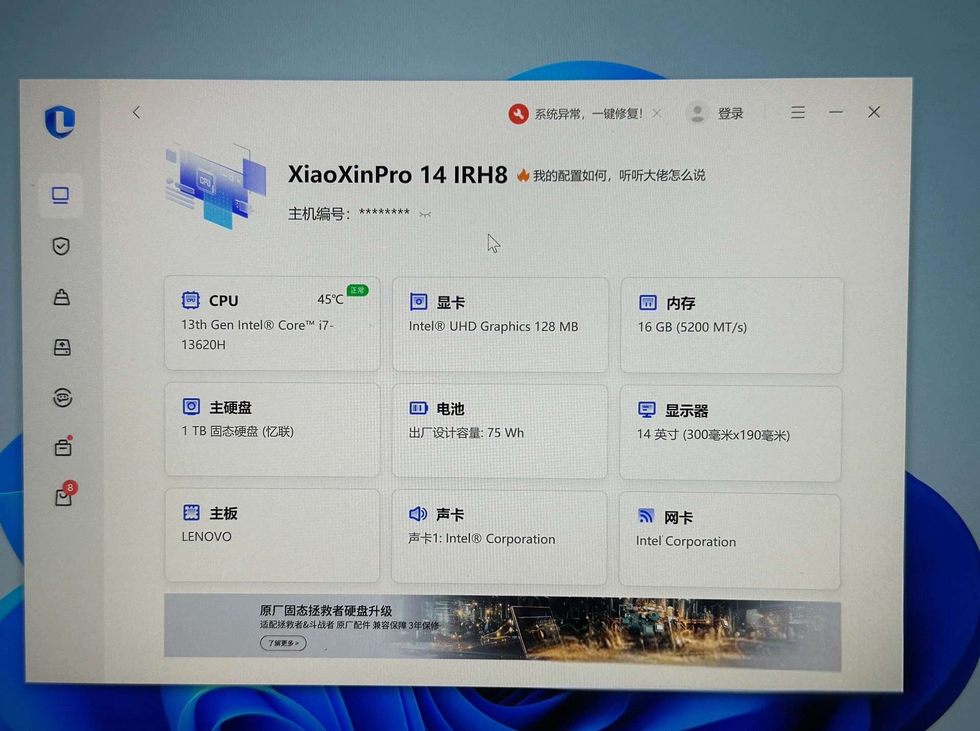 9成新 酷睿13代i7 13620h 16g内存 1t固态硬盘 14寸高分ips屏 适合商务办公 高清影音 一般网络游戏流畅运行