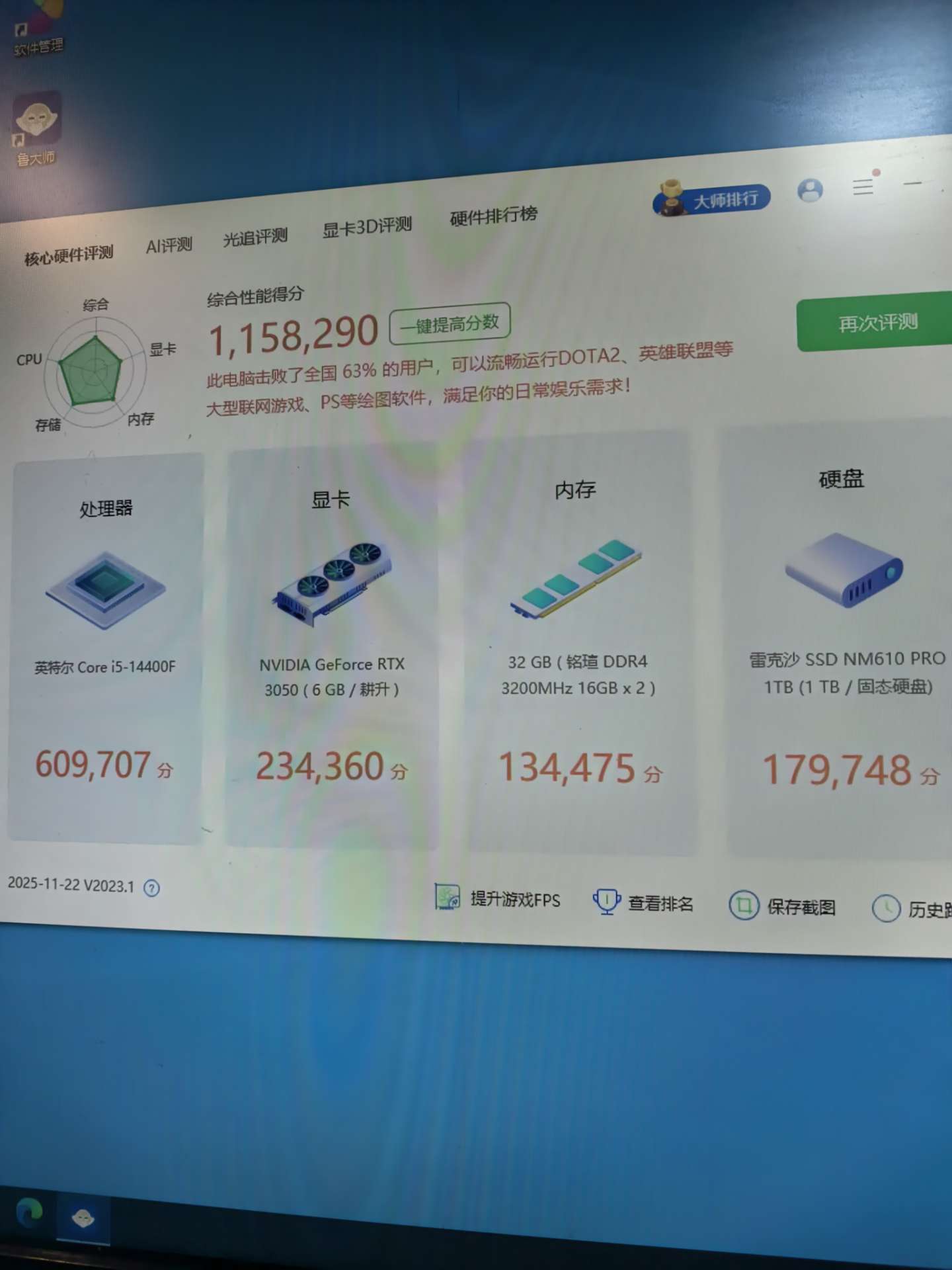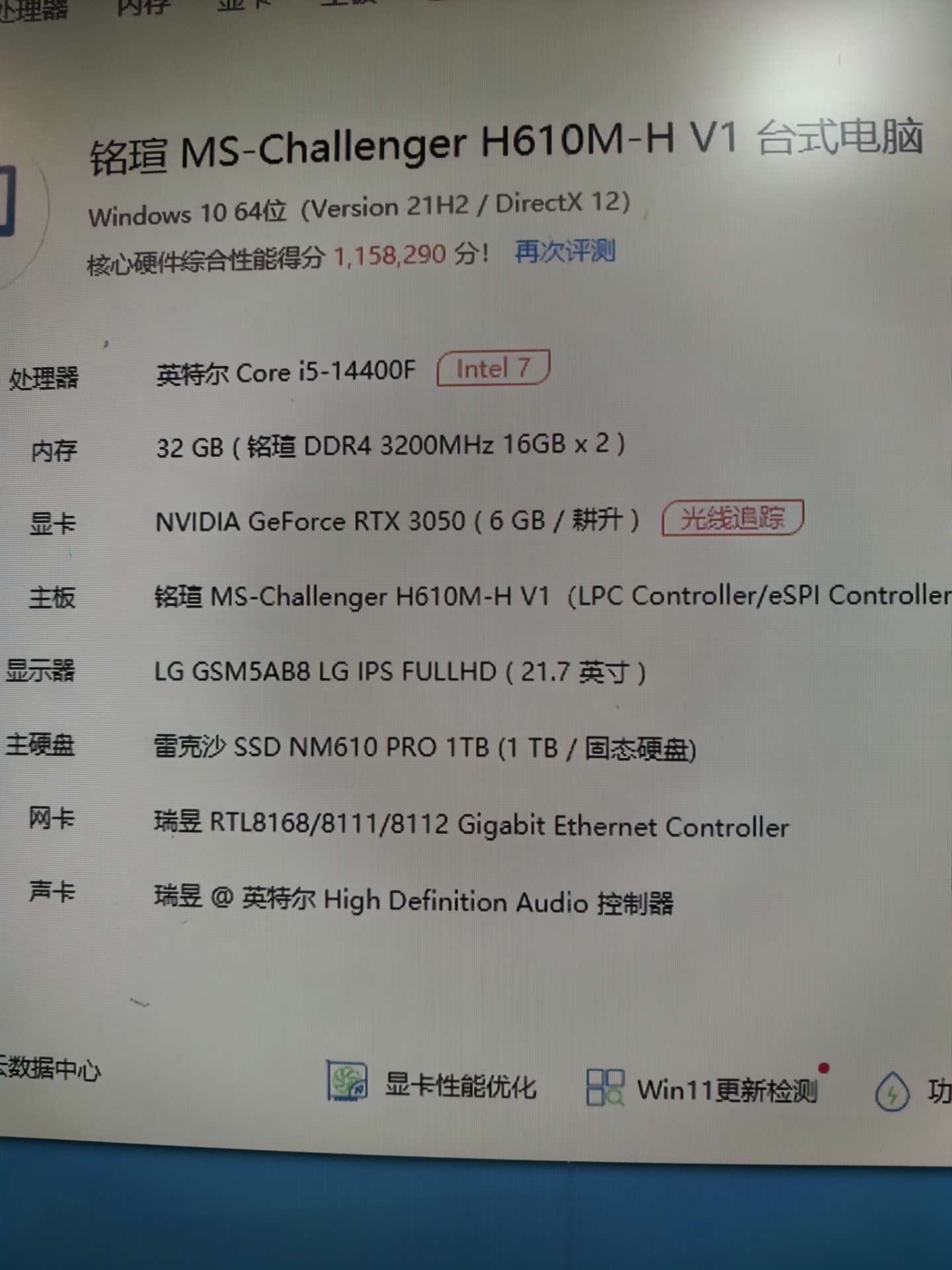 全新配件质保全 酷睿14代i5 14400f cpu 铭瑄h610m主板 铭瑄d4 3200 16x2 32G内存 雷克沙1T nvme固态硬盘 耕升rtx3050 6G独立显卡 战斧t6额定600W电源 侧透机箱