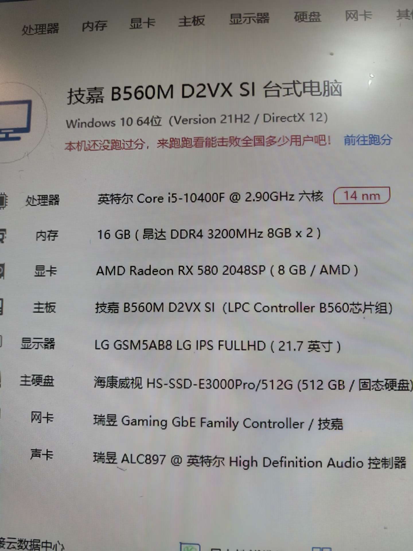 8成新 酷睿10代i5 10400f cpu 技嘉b560m主板 16G内存 rtx580 8G独立显卡 额定500W电源 适合商务办公 高清影音 网络游戏流畅运行