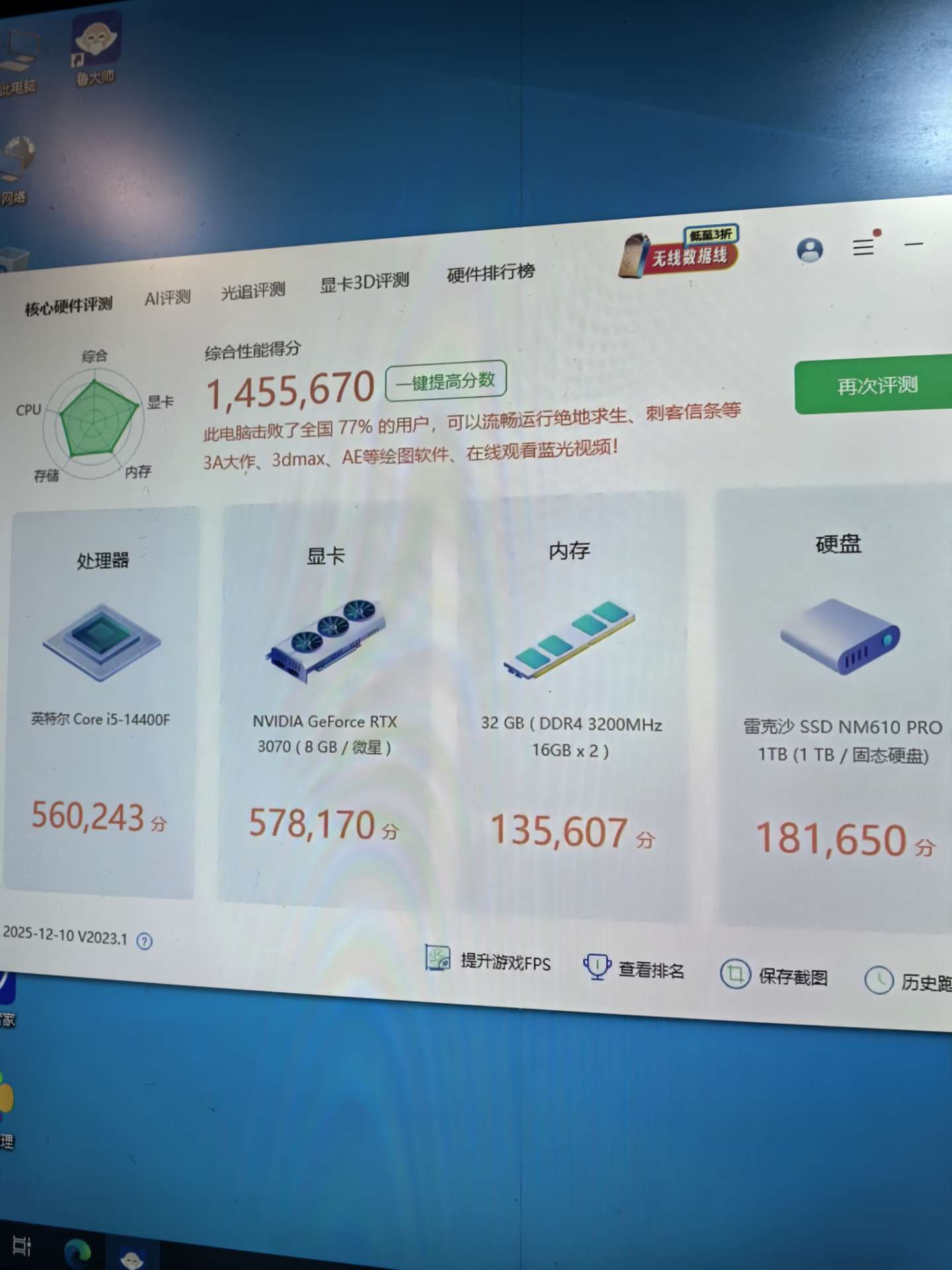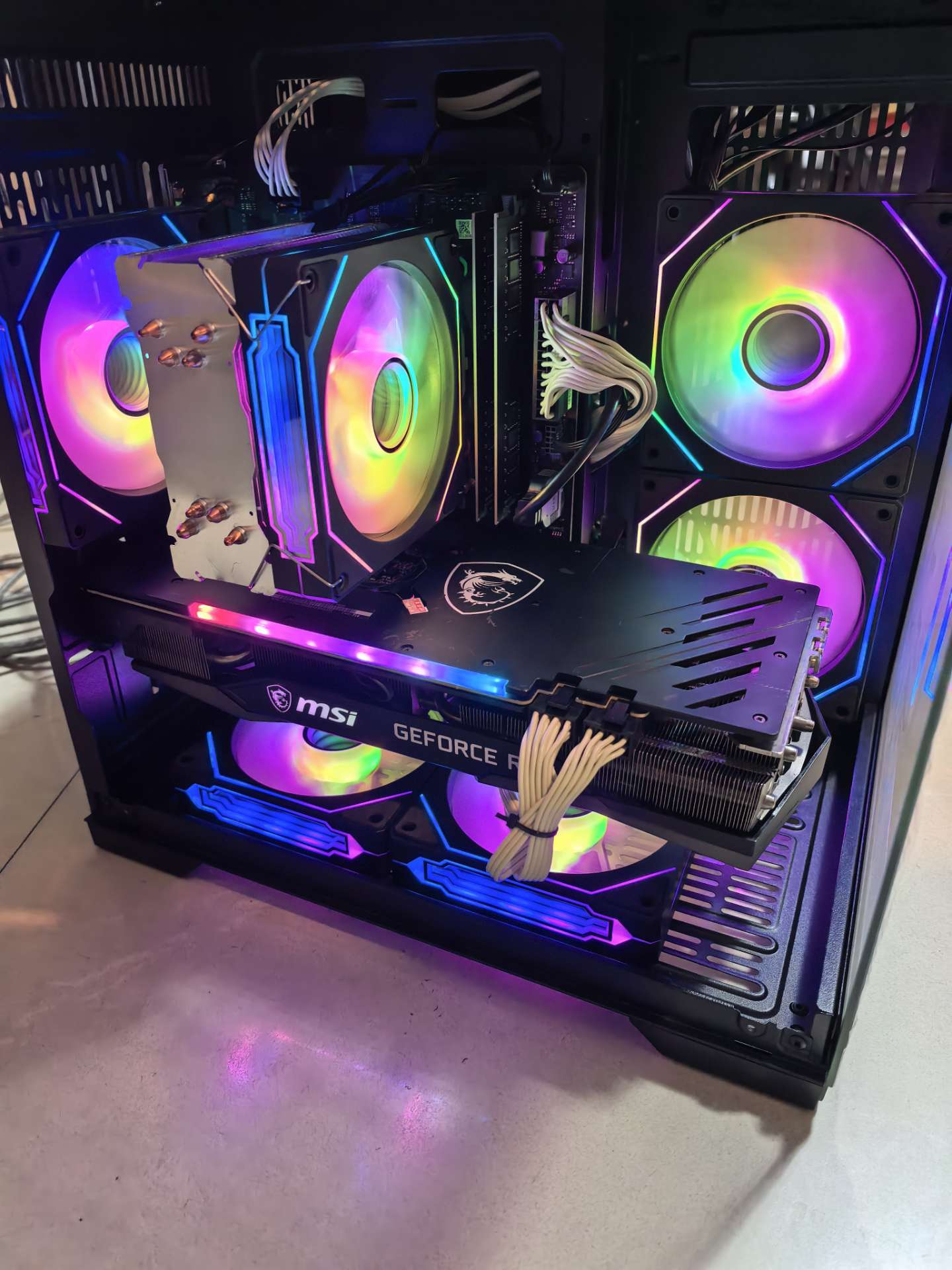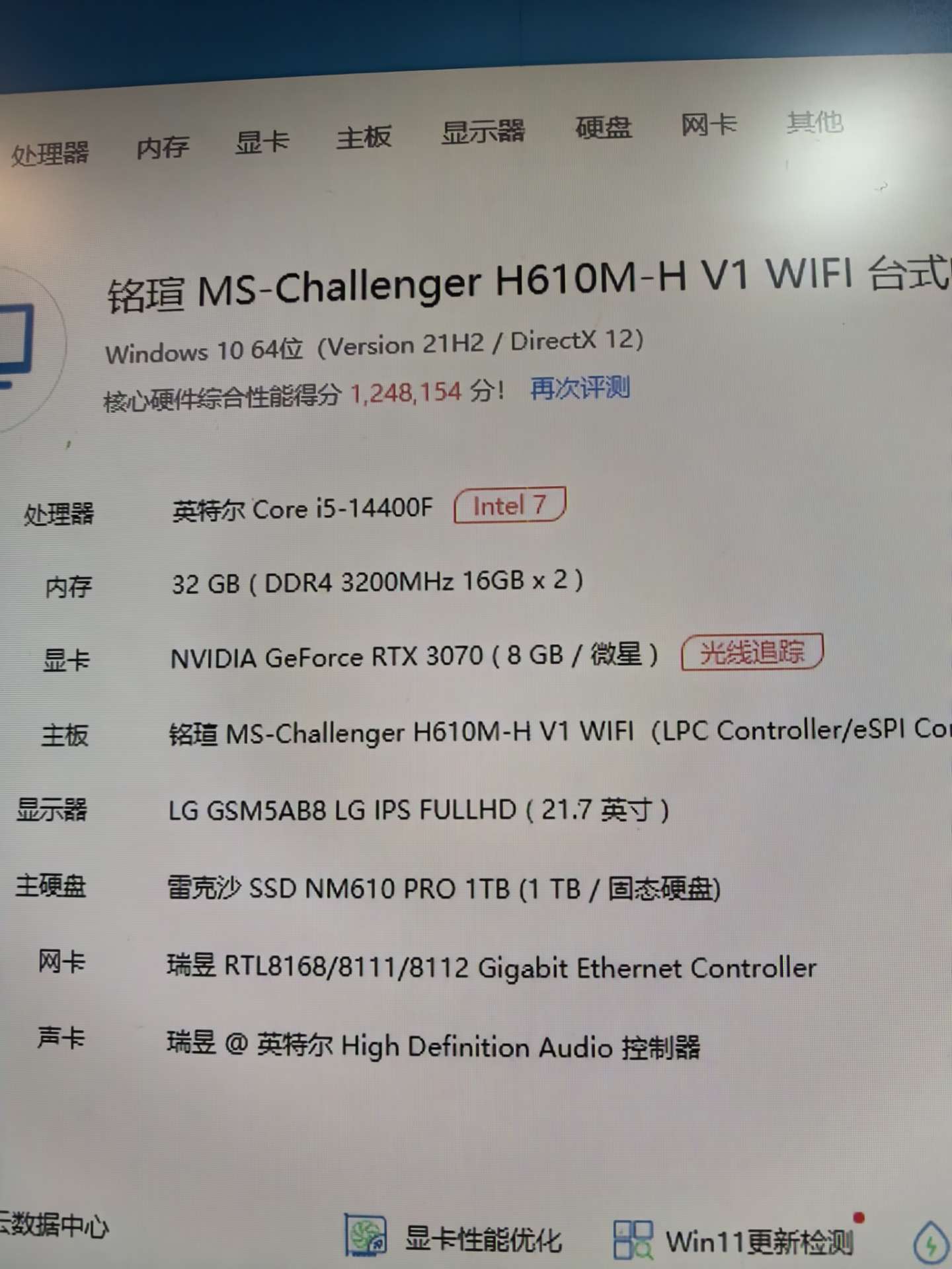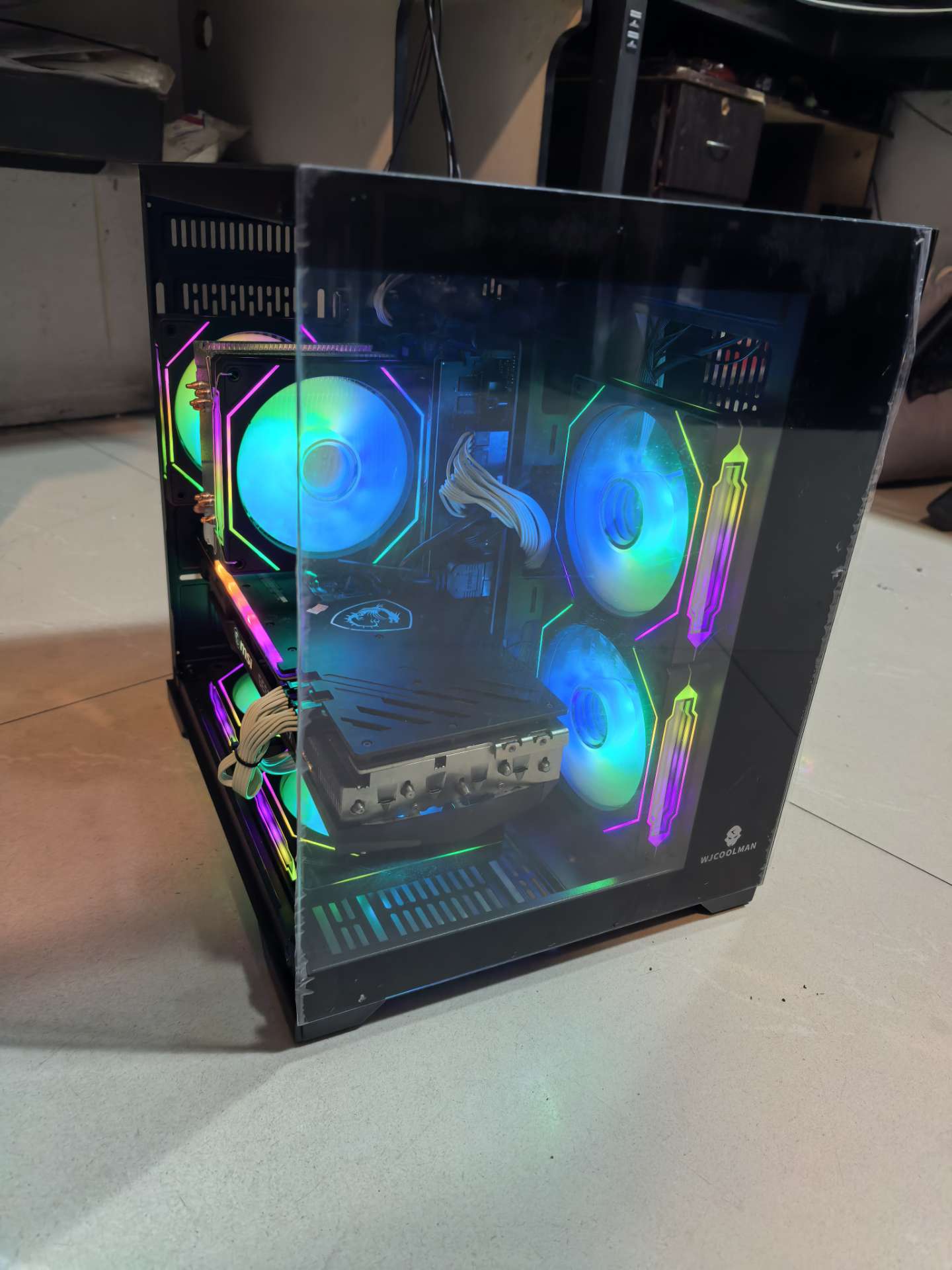显卡是二手的 其他都是全新配件 酷睿14代i5 14400f cpu 铭瑄h610m wifi主板 杰灵d4 3200 16x2 32G内存 雷克沙1T nvme固态硬盘 微星rtx3070 8G独立显卡 战斧t6额定600W电源 海景房机箱