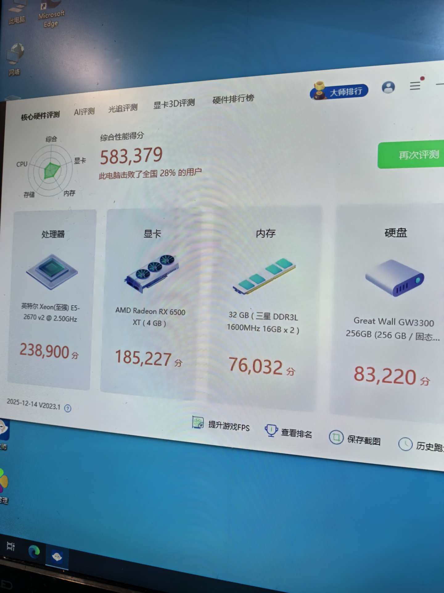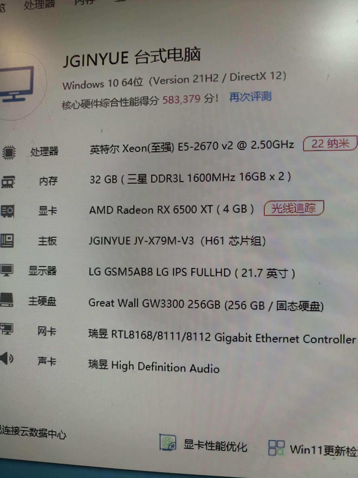 9成新 e5 2670v2 10核20线程cpu 精粤x79主板 32G内存 256G nvme固态硬盘 rx6500xt 4G独立显卡 额定500W电源 侧透机箱 适合商务办公 高清影音 网络游戏流畅运行