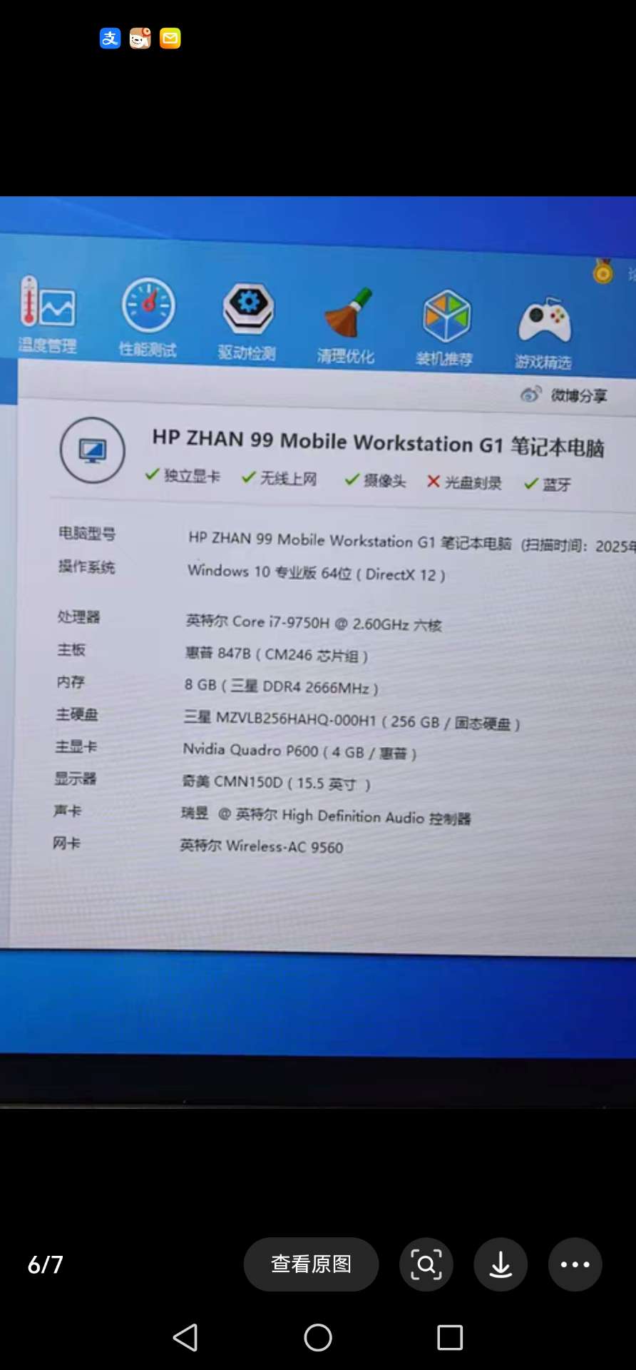 8成新 移动工作平台 酷睿9代i7 9750h 8G内存 256G固态硬盘 p600 4G专业图形显卡 15.6高分ips屏 适合商务办公 高清影音 一般画图 视频剪辑等