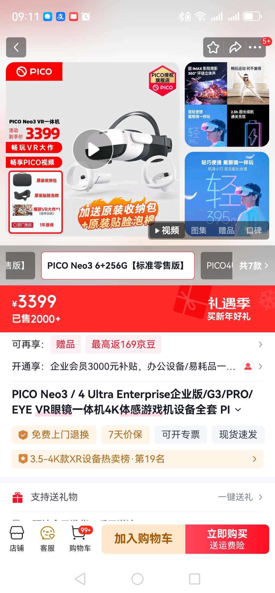 99新 高通骁龙xr2 ai处理器 6G运行内存 256G存储 玩vr游戏 看vr直播 全景观影超爽 也可链接手机 pc设备 steam串流 巨屏享受游戏时光