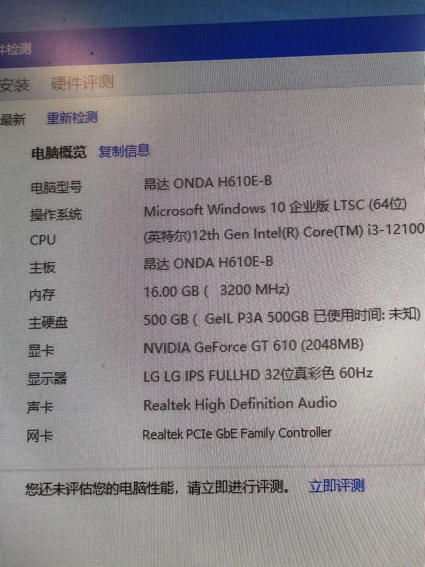 全新配件质保全 酷睿12代i3 12100f 昂达h610m主板 杰灵d4 3200 16G内存 金邦500G nvme固态硬盘 昂达gt610 2G独立显卡 战斧t4额定400W电源 长城商务机箱