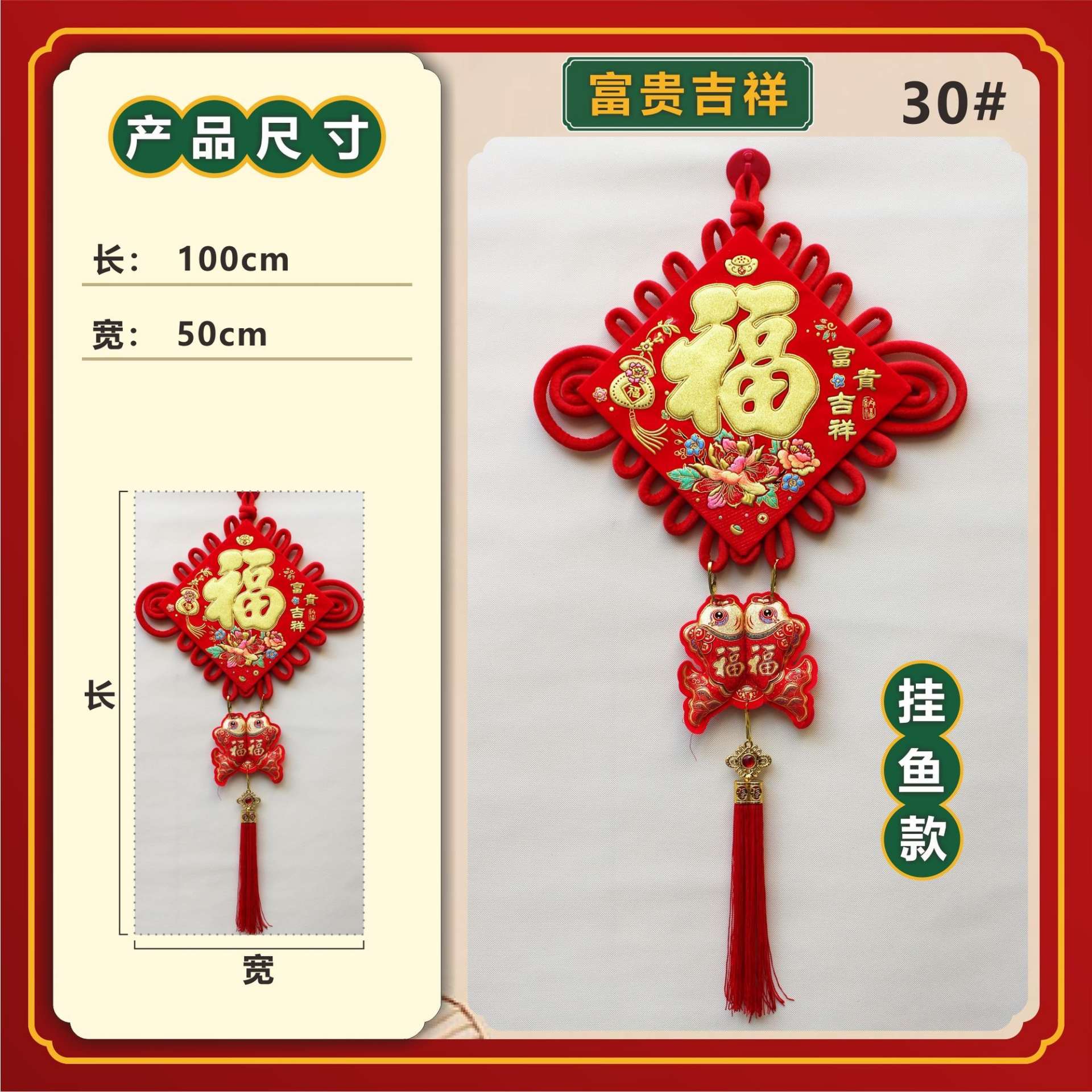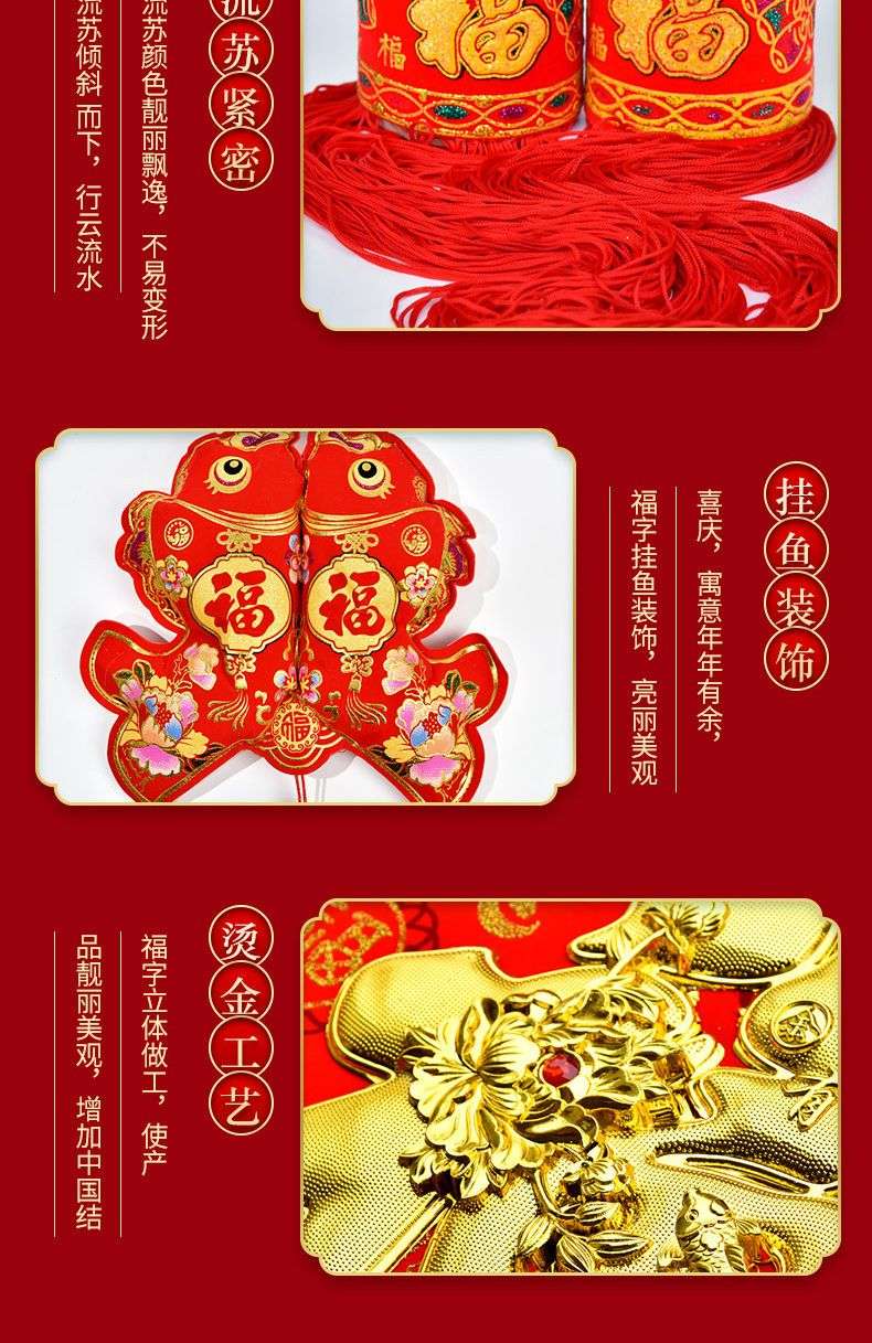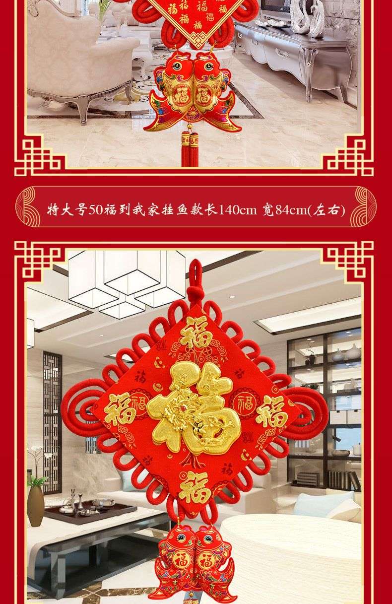 新年福字刺绣双鱼挂件,烫金工艺,红色为主,流苏设计,寓意年年有余,喜庆吉祥。填充饱满,做工细致,挂家里、店铺、办公室都合适。 尺寸:长100cm,宽50cm,