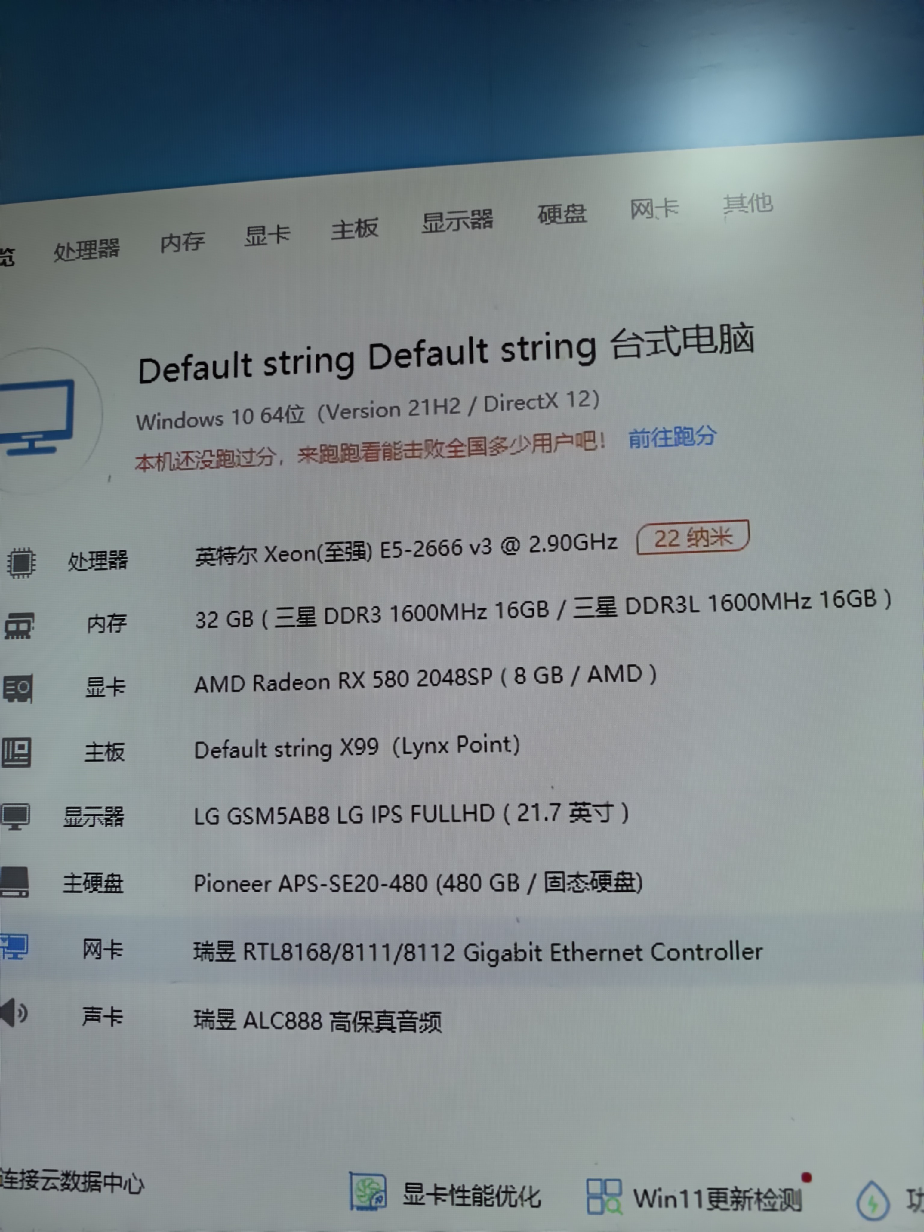 8成新 e5 2666v3 10核20线程cpu x99主板 32G内存 480G nvme固态硬盘 rx580 8G独立显卡 额定500W电源 适合商务办公 高清影音 网络游戏流畅运行