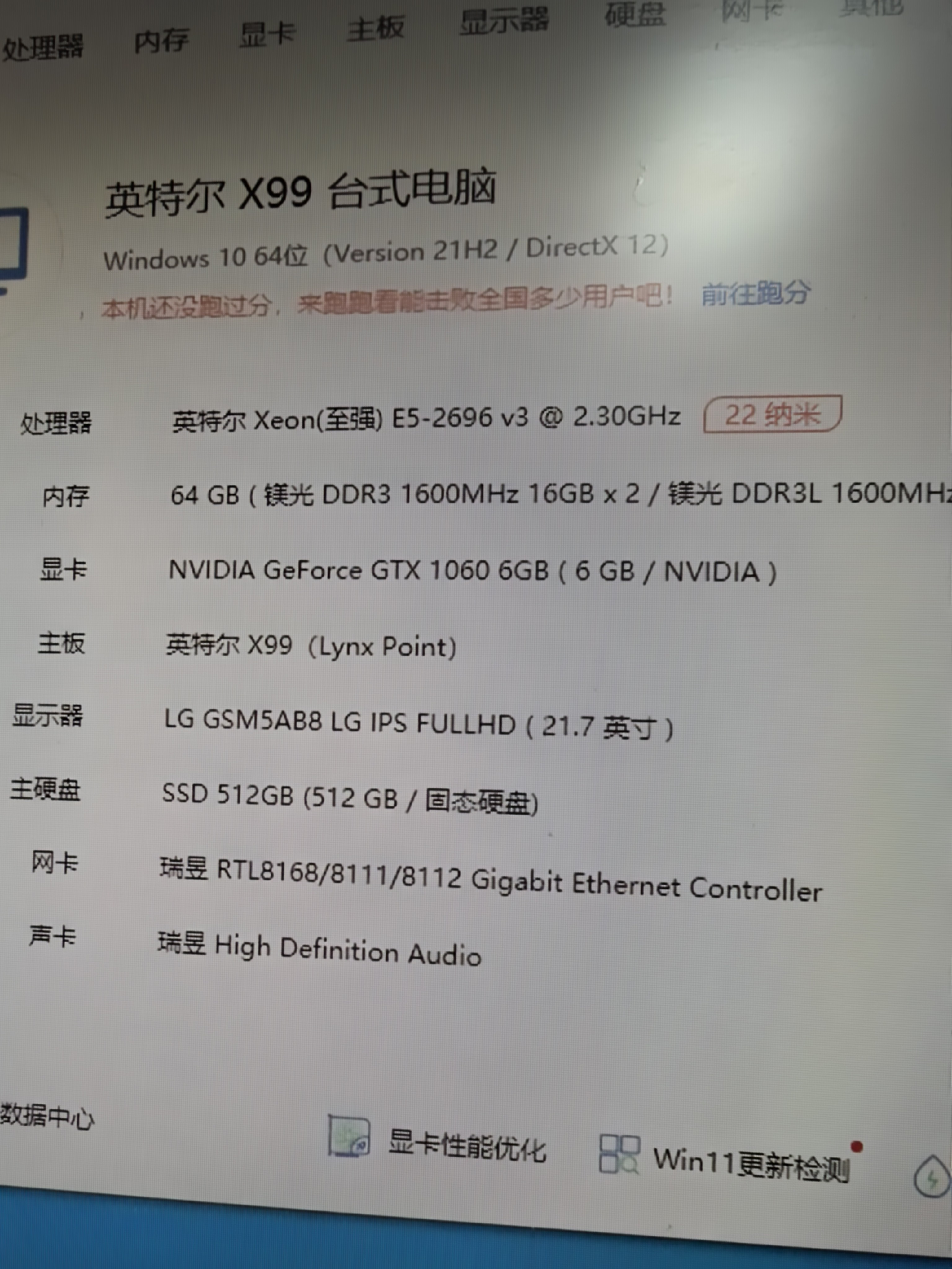 8成新 志强e5 2696v3 18核36线程cpu x99主板 64G内存 512G nvme固态硬盘 gtx1060 6G独立显卡 额定500W电源 适合商务办公 高清影音 网络游戏流畅运行