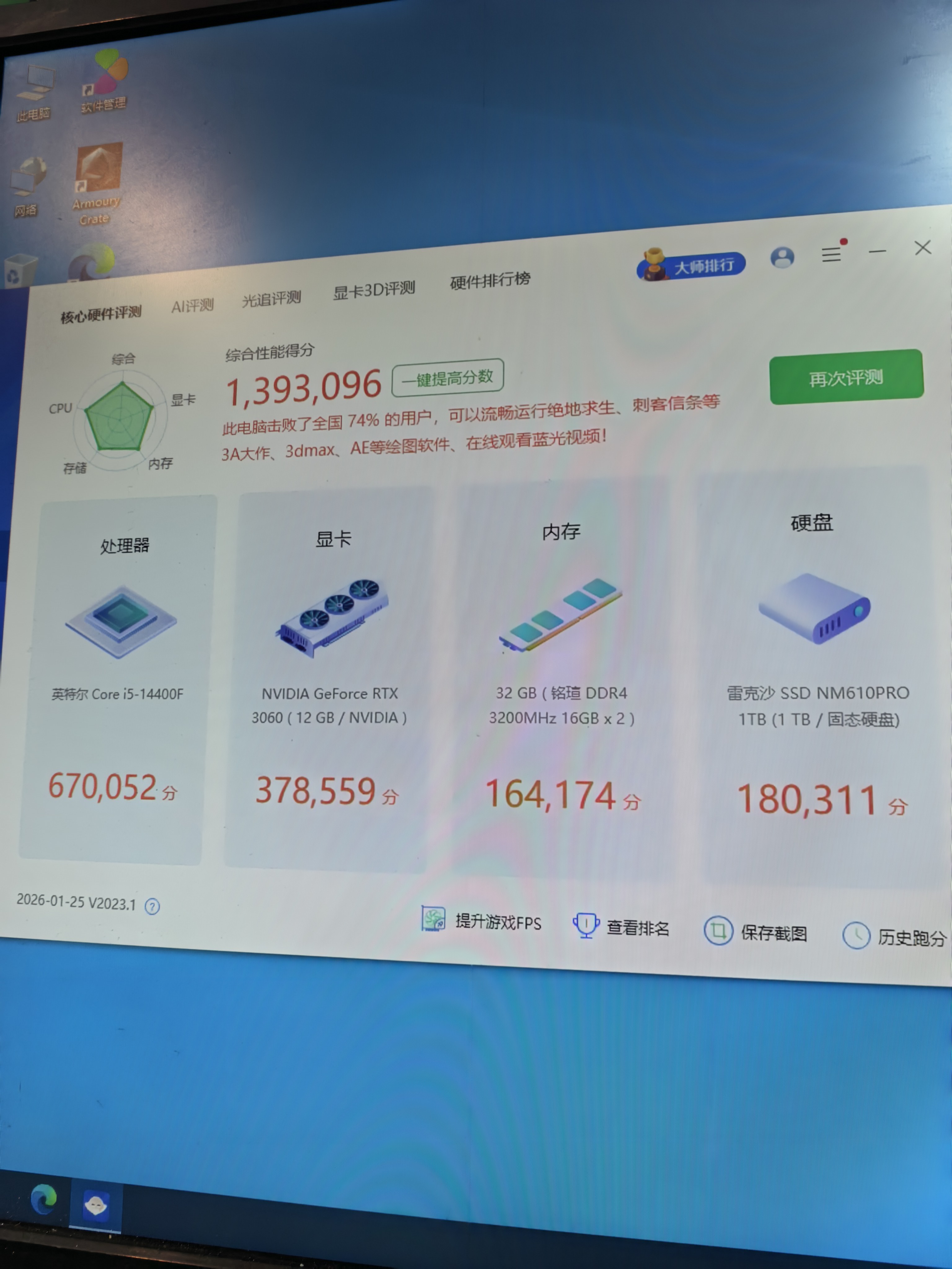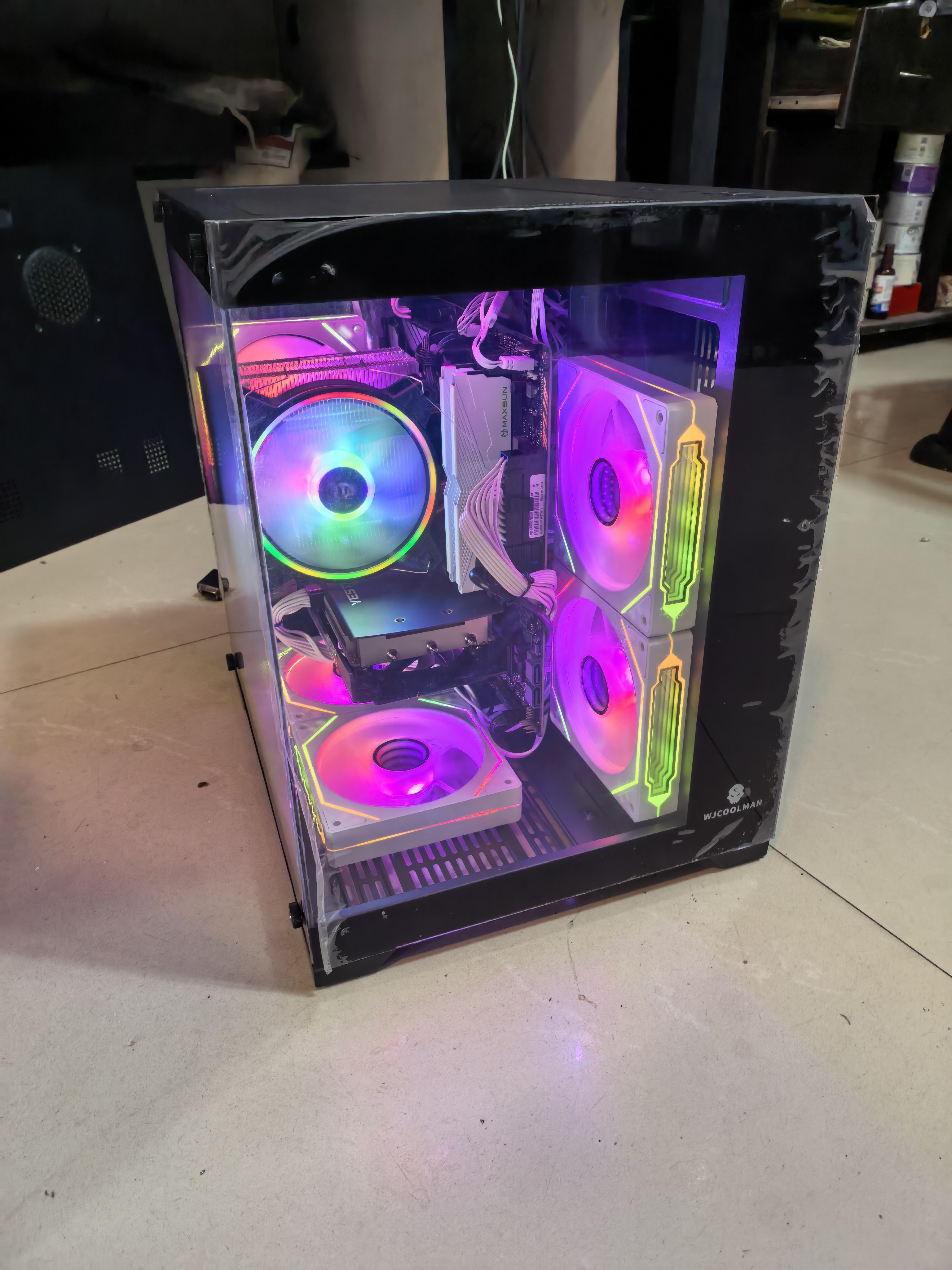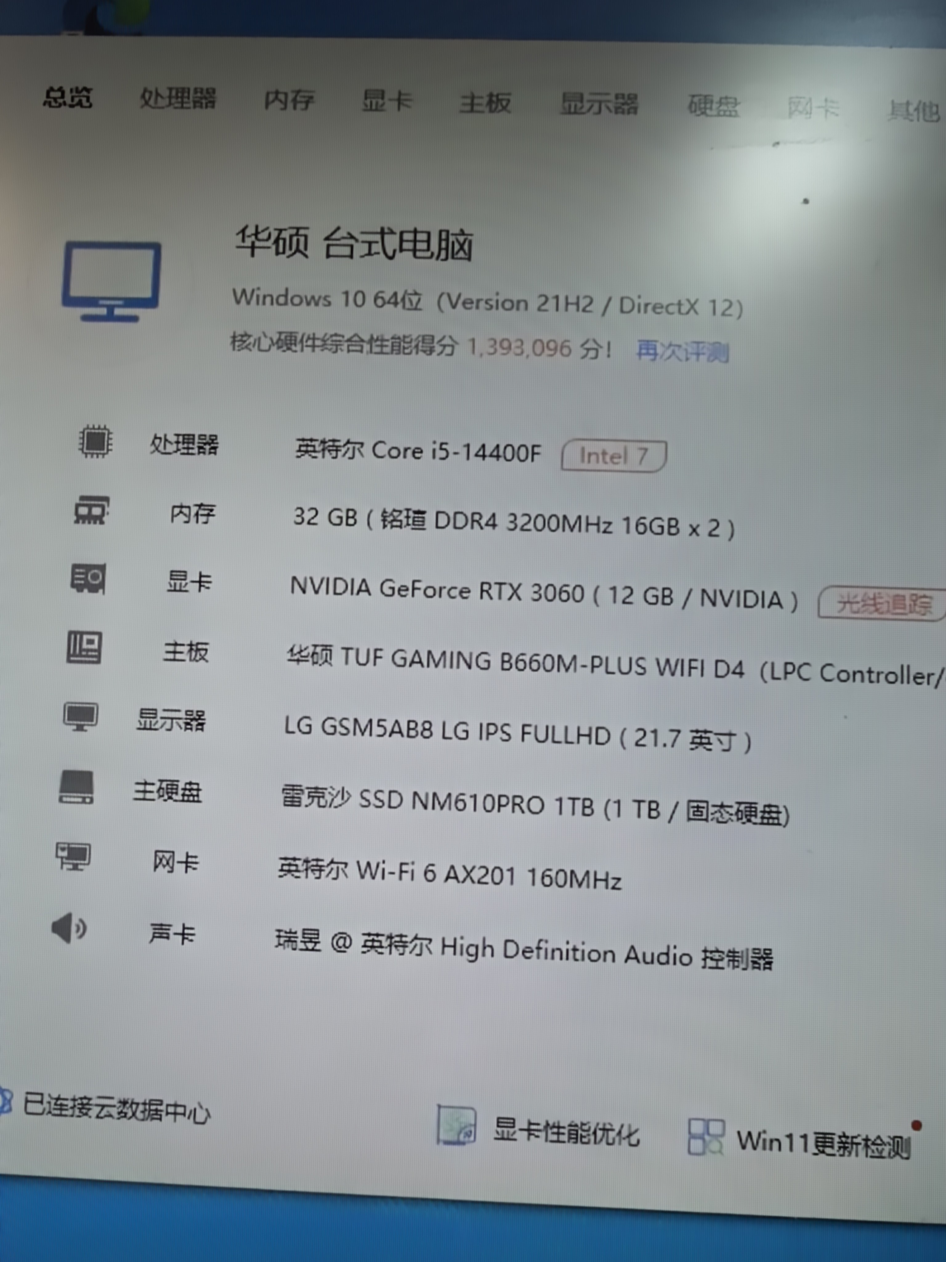 主板是二手的,其他都是全新配件,酷睿14代i5 14400f cpu 华硕b660m wifi主板 铭瑄d4 3200 16x2 32G内存 雷克沙1T nvme固态硬盘 盈通rtx3060 12G独立显卡 战斧额定600W电源 海景房机箱