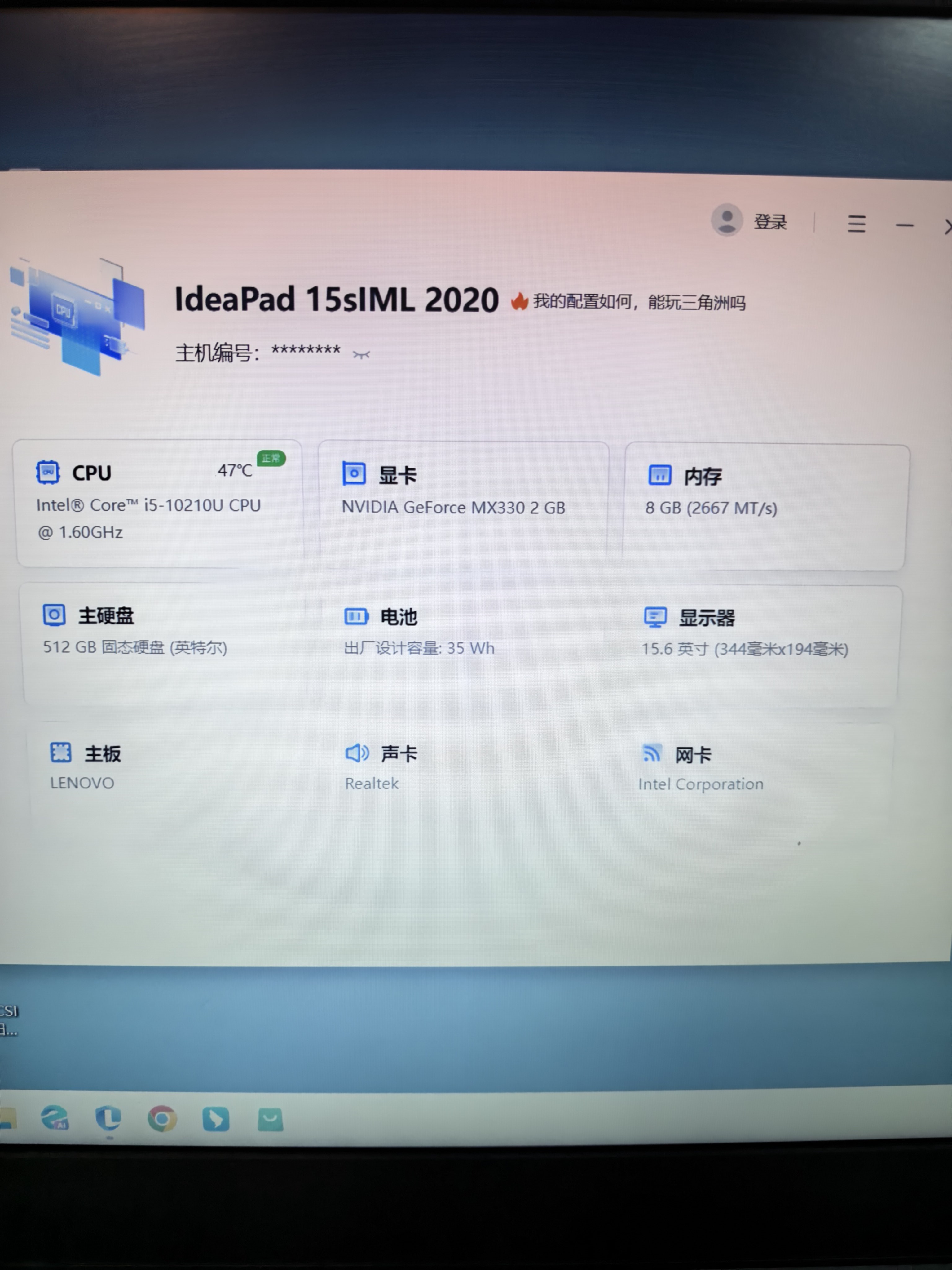 8成新 酷睿10代i5 10210u 8G内存 512G固态硬盘 mx330 2G独立显卡 15.6寸高分屏 适合商务办公 高清影音 一般网络游戏流畅运行