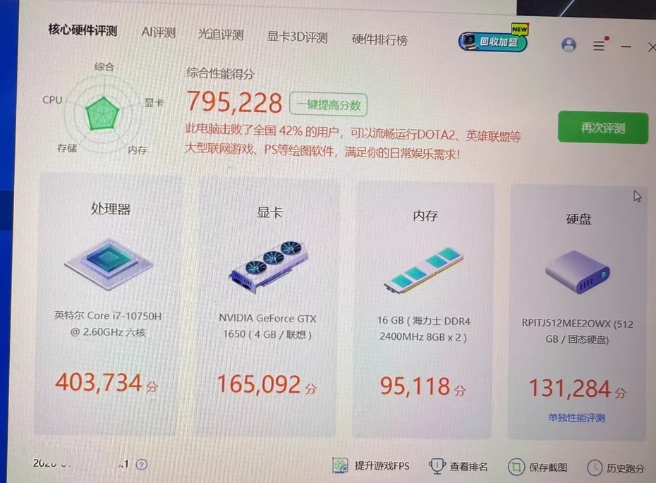8成新 酷睿10代i7 10750h 16G内存 512G固态硬盘 gtx1650 4G独立显卡 15.6高分屏 适合商务办公 高清影音 网络游戏流畅运行