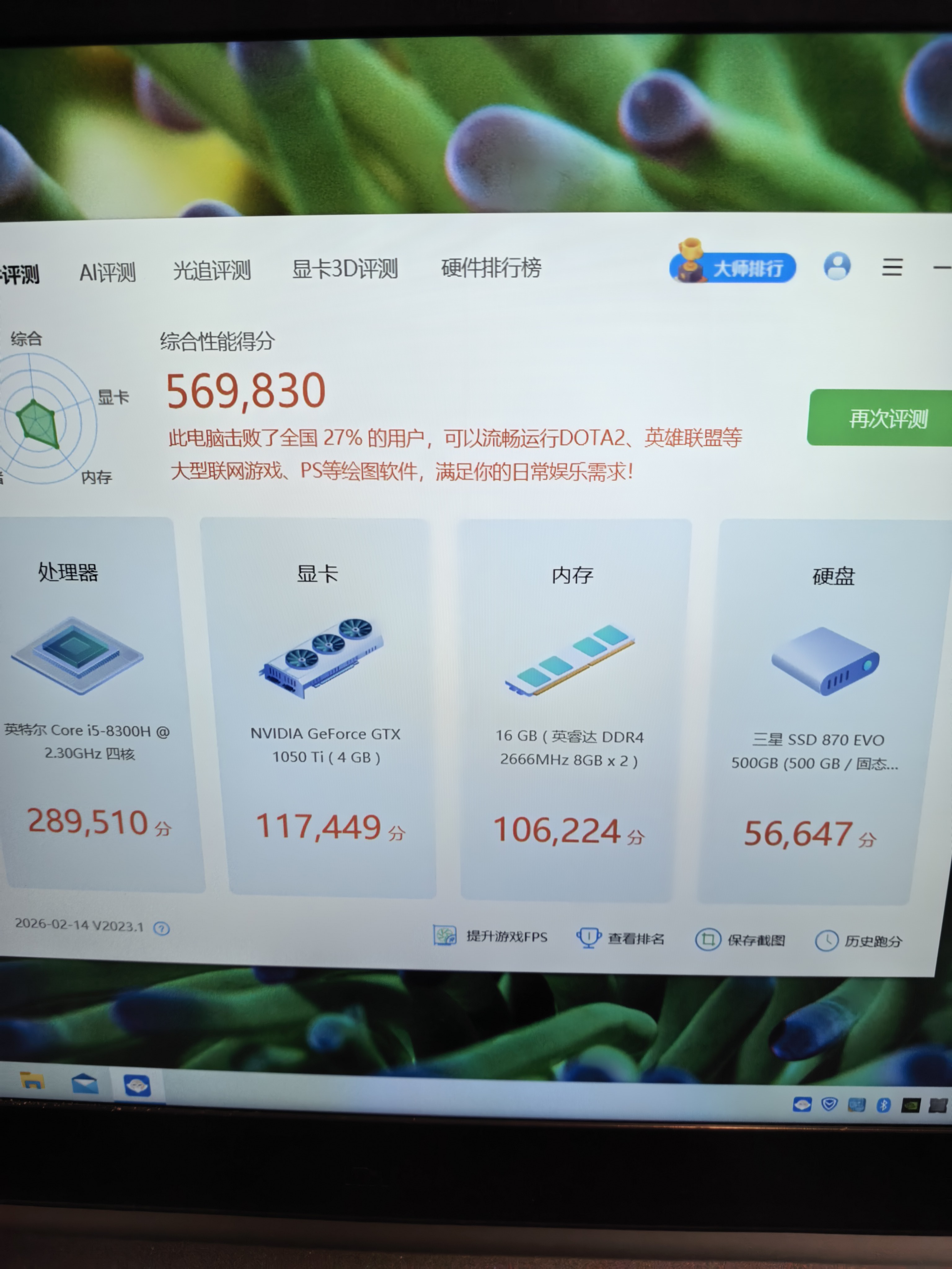 8成新 酷睿8代i5 8300h 16G内存 500G固态硬盘 gtx1050ti 4G独立显卡 15.6寸高分屏 适合商务办公 高清影音 一般网络游戏流畅运行