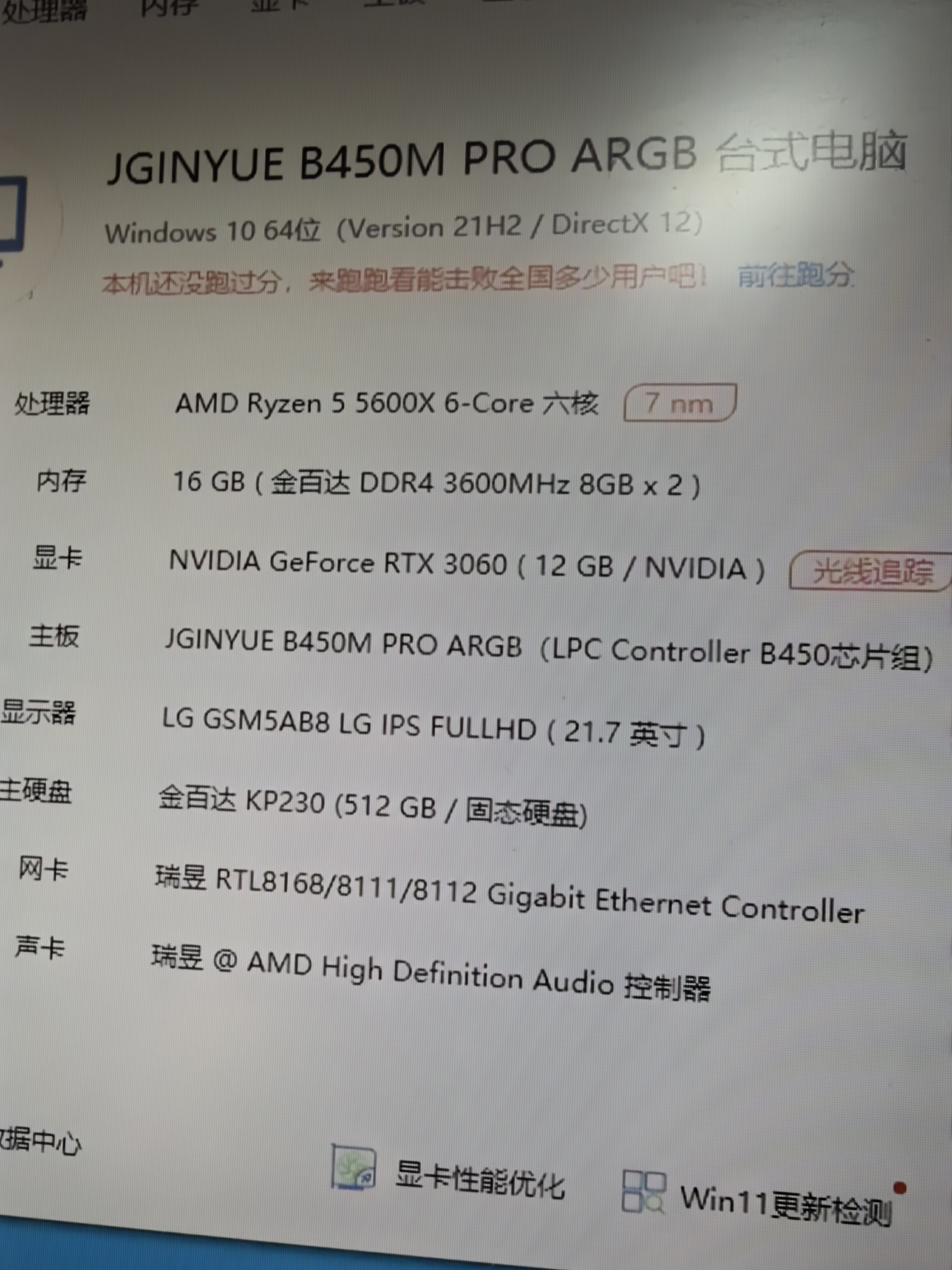 全新配件质保全 锐龙r5 5600x cpu 精粤b450m主板 金百达d4 3600 8x2 16G内存 金百达512G nvme固态硬盘 盈通rtx3060 12G独立显卡 战斧t6额定600W电源 海景房机箱