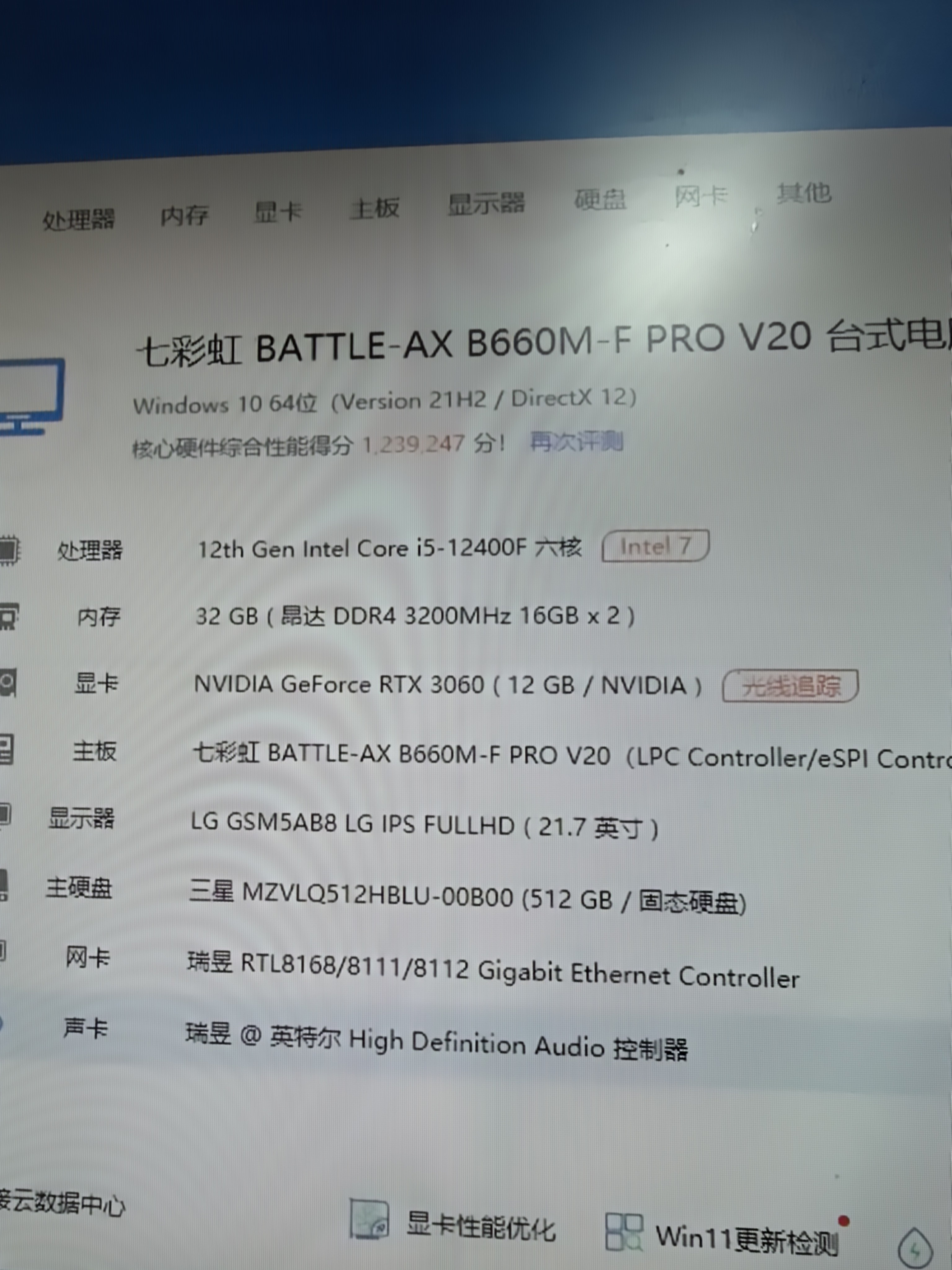 9成新 酷睿12代i5 12400f cpu 七彩虹b660主板 d4 3200 16x2 32G内存 三星512Gnvme固态硬盘 七彩虹rtx3060 12G独立显卡 额定500W电源 侧透机箱