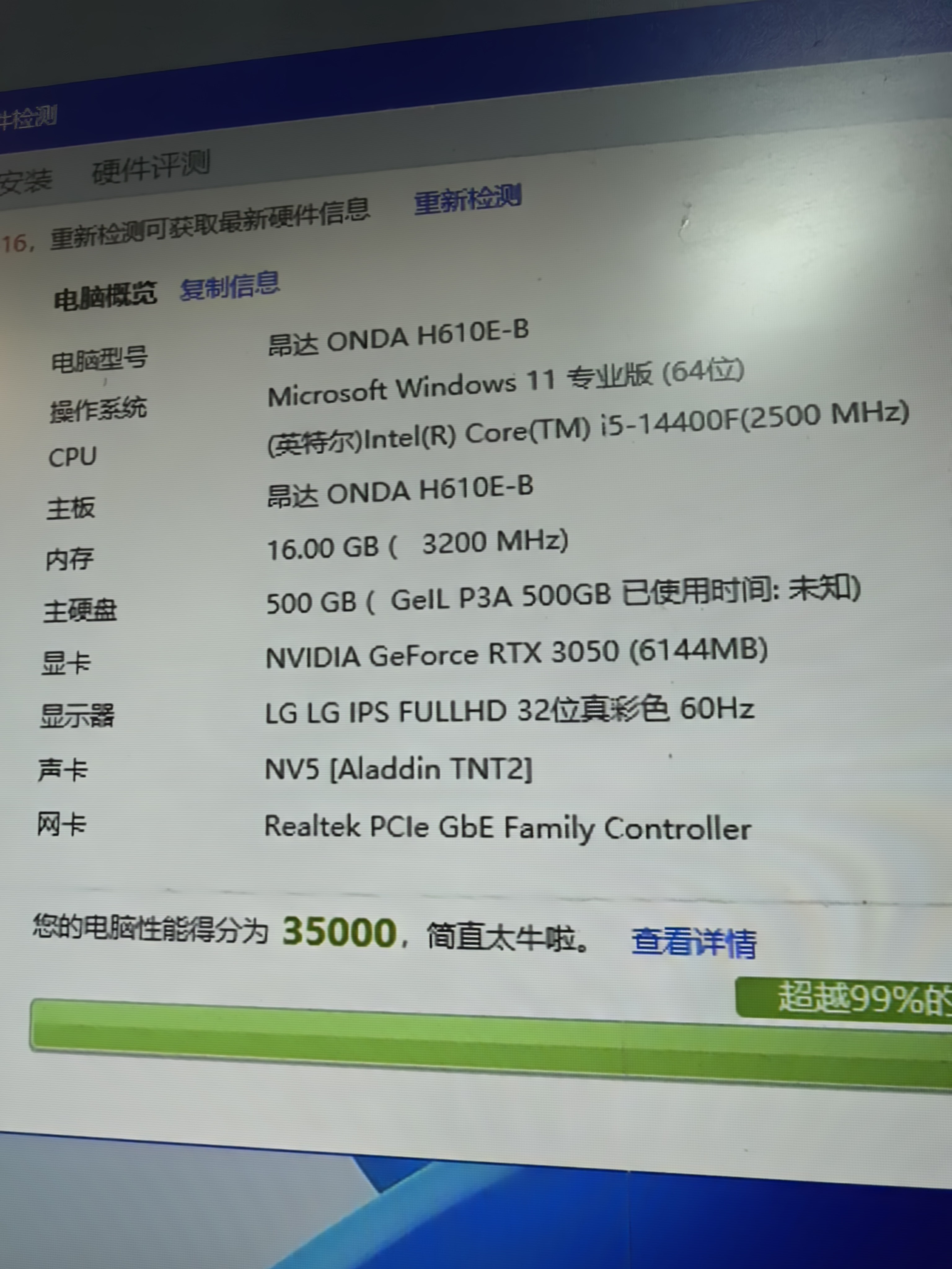 全新配件质保全 酷睿14代i5 14400f cpu 昂达h610m主板 金百达d4 3200 16G内存 金邦500G nvme固态硬盘 耕升rtx 3050 6G独立显卡 航嘉额定500W电源 侧透机箱