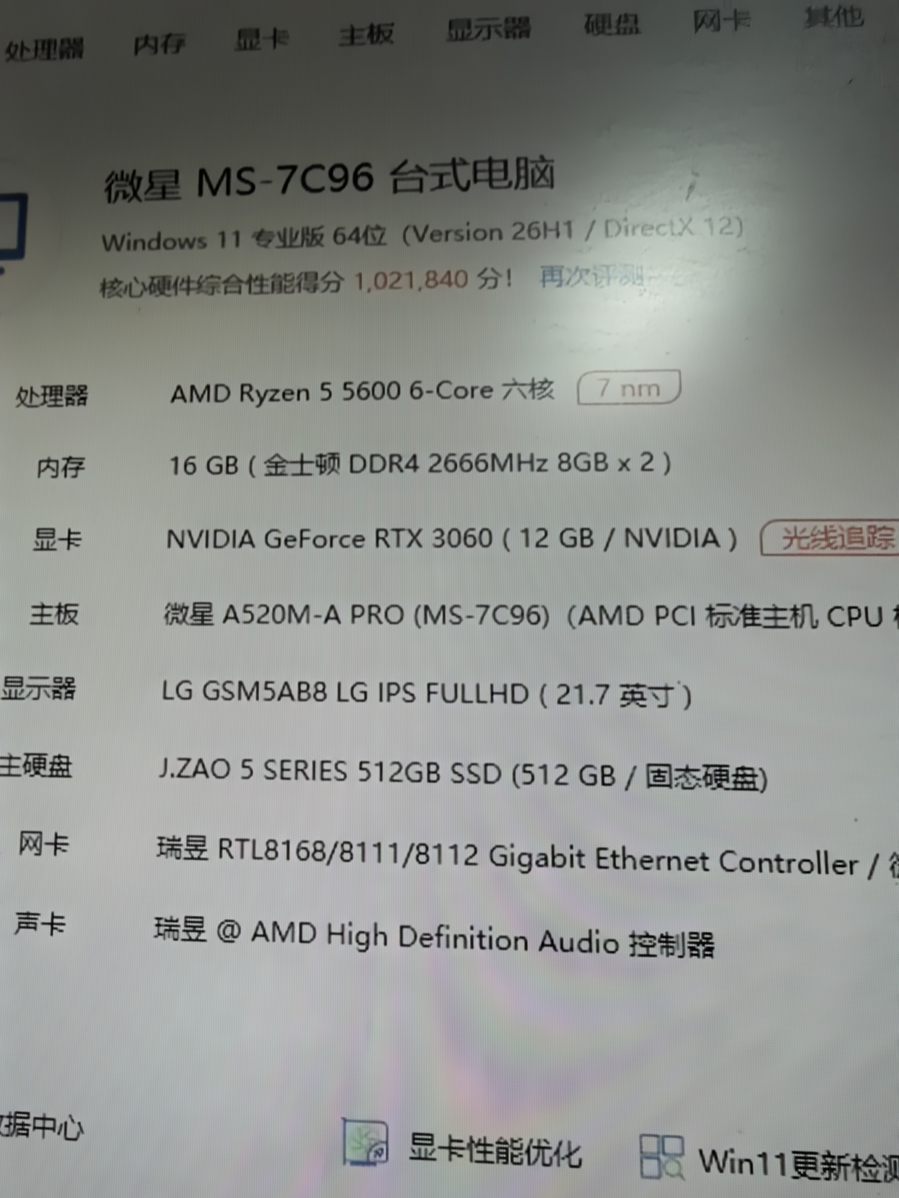 只有内存是二手的,其他都是全新配件 锐龙r5 5600 cpu 微星a520主板 金士顿野兽d4 8Gx2 16G内存 京造512G nvme固态硬盘 昂达rtx3060 12G独立显卡 战斧额定600W电源 侧透机箱