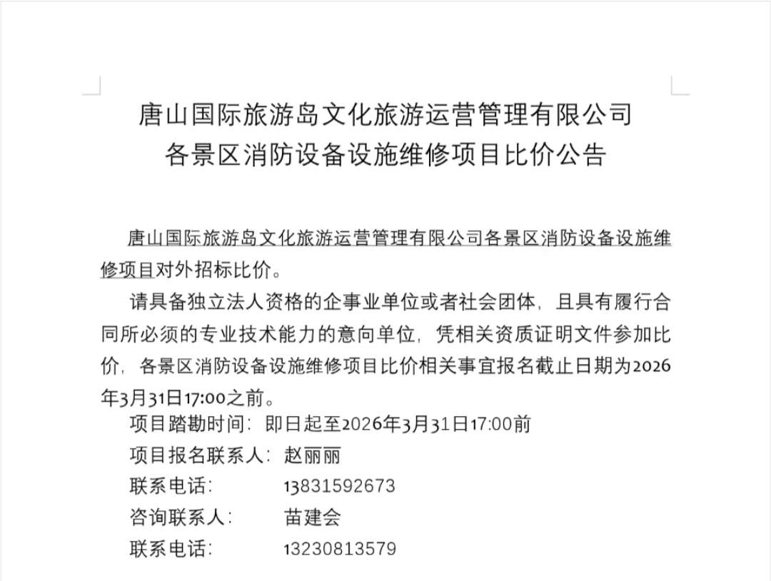 唐山国际旅游岛文化旅游运营管理有限公司各景区消防设备设施维修项目比价公告