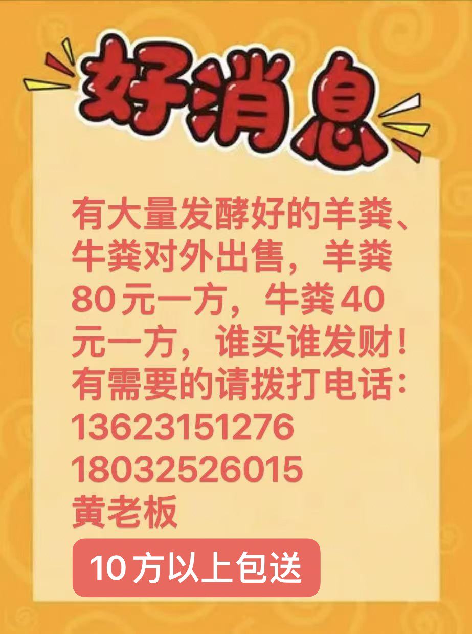 有大量发酵好的羊粪、牛粪对外出售,质优价廉,羊粪80元一方,牛粪40元一方。10方以上包送,联系电话13623151276