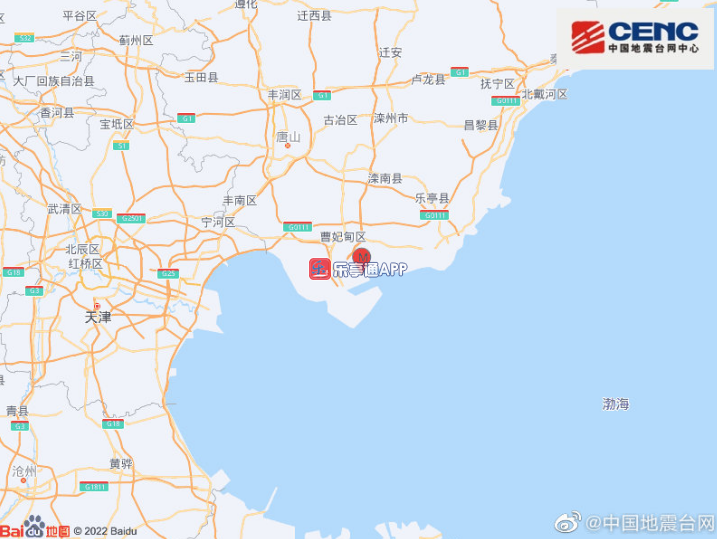 曹妃甸区海域发生2.4级地震,震源深度12千米