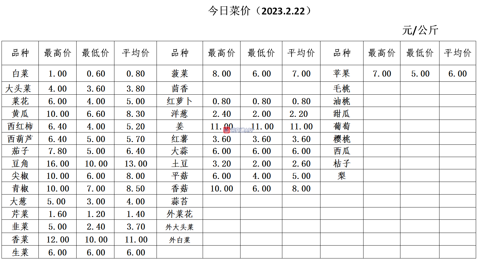 行情走势(2023.2.22) 与昨天相比,今天入市的新鲜蔬菜、水果品种丰富,货源充足,交易状态良好。 蔬菜交易中地产大白菜、大头菜、豆角、芹菜等主要品种蔬菜价格平稳,成交率高。白黄瓜价格下滑,今天最高批发价格为10元/公斤,比昨天下降2元/公斤。西红柿今天最高批发价格为6.40元/公斤,比昨天下降0.60元/公斤。韭菜入市质量较好,价格上涨,今天最高批发价格为5元/公斤,比昨天上涨1元/公斤,吸引广大客商前来选购。水果交易中草莓、菠萝等应季水果纷纷入市,价格稳定,深得广大消费者青睐。