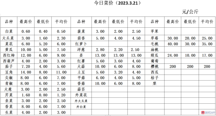 行情走势(2023.3.21) 与昨天相比,今天市场交易量稳步提升,价格行情波动不大,交易持续升温。 蔬菜类,大头菜入市量增加,价格下滑,今天最高批发价格3.6元/公斤,比昨天下降了0.6元/公斤。优质白黄瓜价格突涨,最高批发价格10元/公斤,比昨天高出2元/公斤,一般批发价格7.5元/公斤。青椒价格微涨,最高成交价8元/公斤,比昨天高0.4元/公斤,品质好、下市速度加快。春菠菜大量入市,价格稳定,外销量大,一般批发价格2.5元/公斤,鲜嫩可口。西红柿、西葫芦、尖椒等价格基本稳定,供需平衡。 果品类,本地甜瓜交易量日益增多,价格行情波动不大,最高批发价格保持24元/公斤,一般批发价格17元/公斤,绿宝甜瓜品质好、价格较高。另外优质毛桃、草莓、大樱桃等纷纷入市,供不应求。