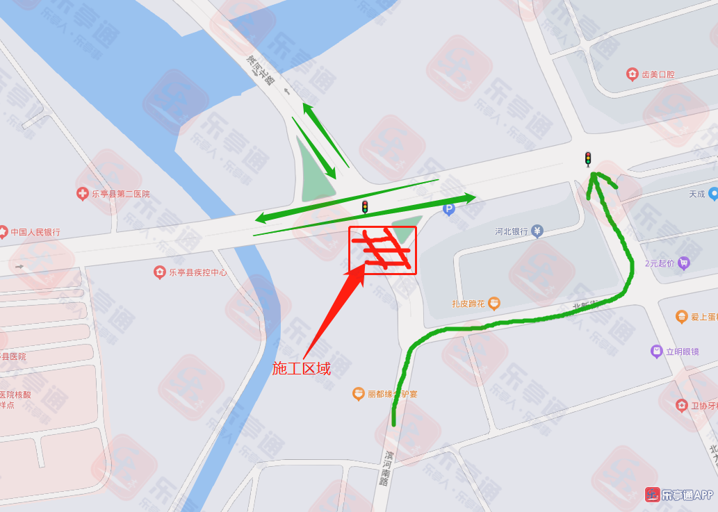 乐亭城区滨河南路与金融街交叉口因施工,临时封闭,请广大驾驶人及行人绕行,做好出行安排!