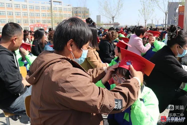 “弱冠而成人,及笄始有字”。家长为学生戴上成人纪念帽。帽檐方正,帽身圆润,流苏若水:方正为人,圆梦人生,上善若水,从善如流。