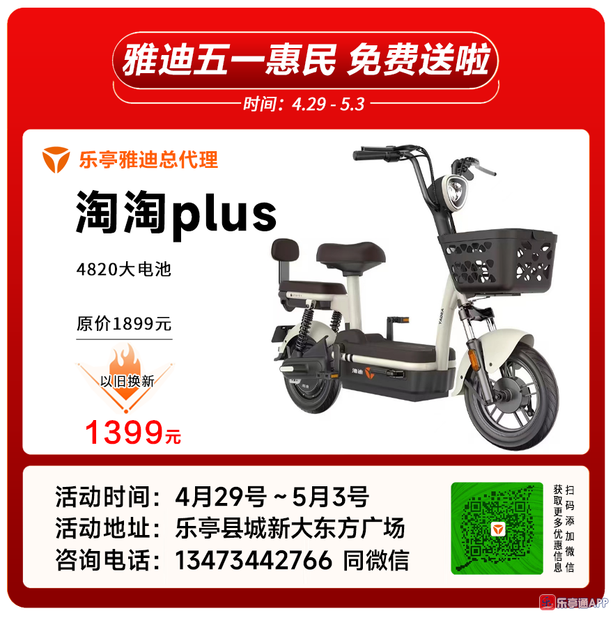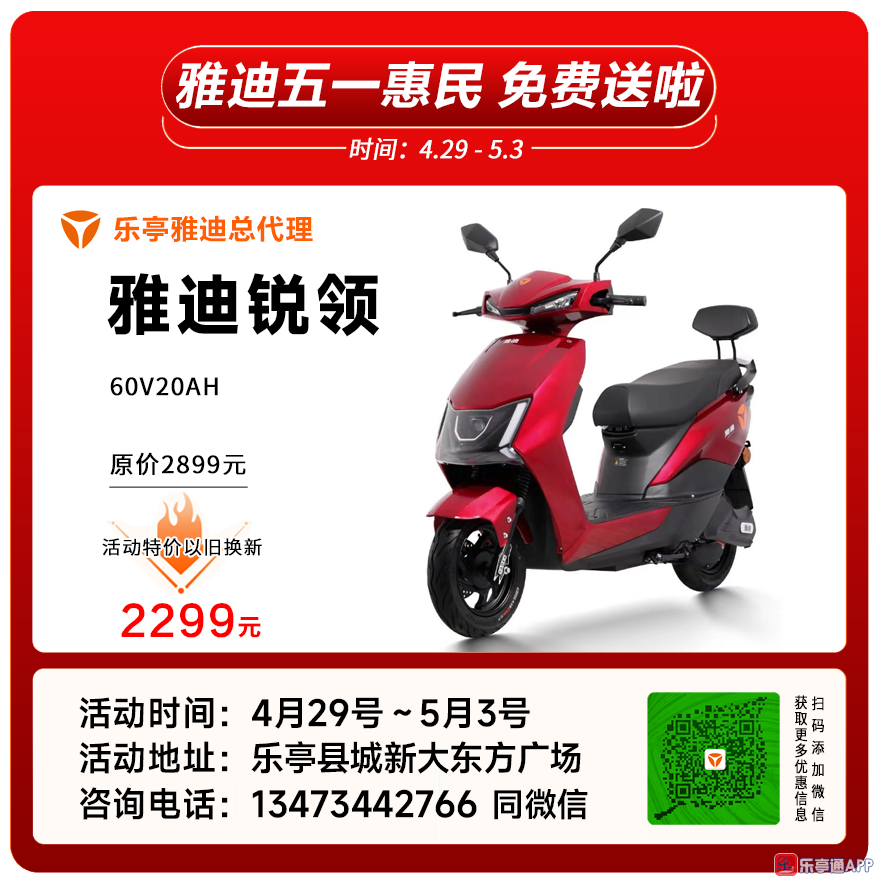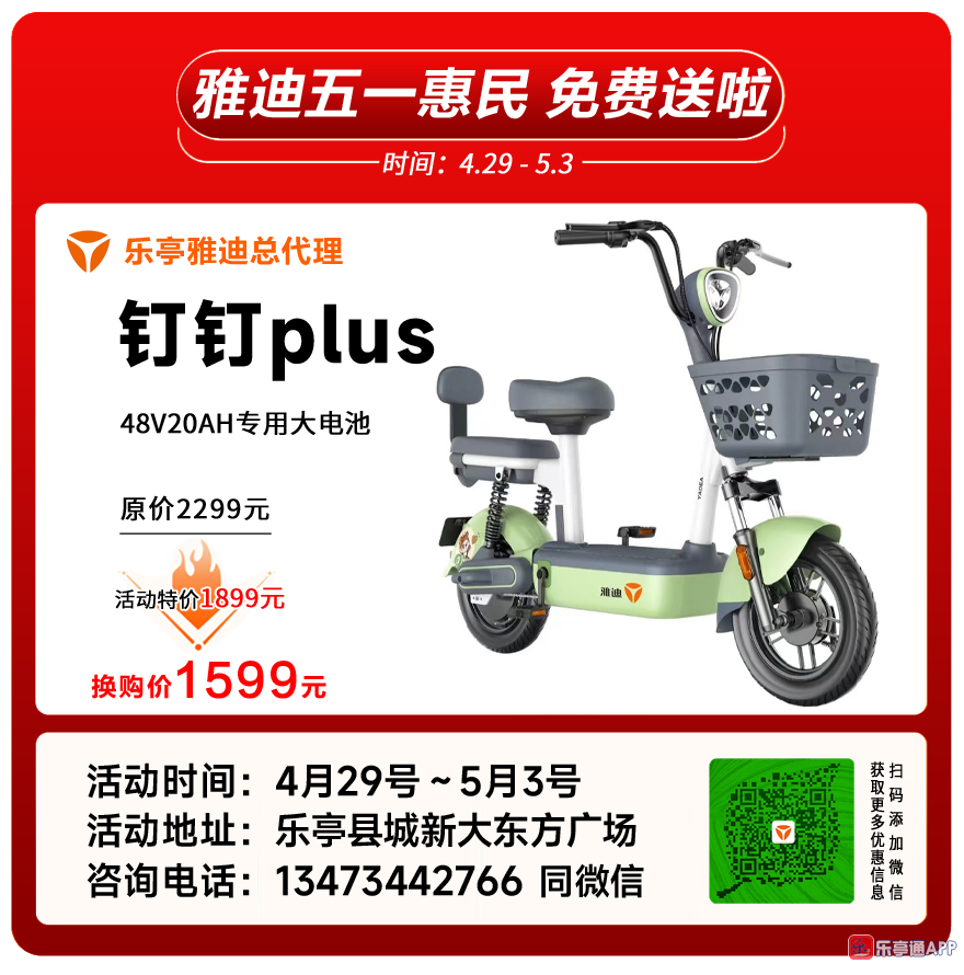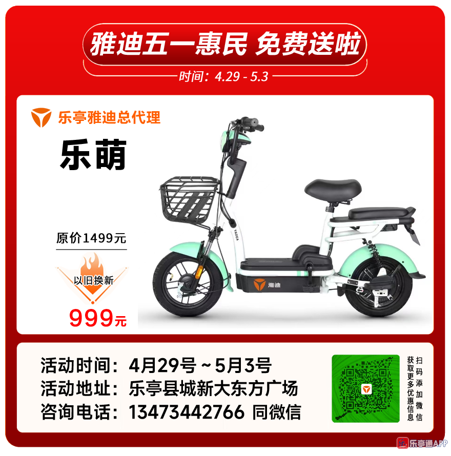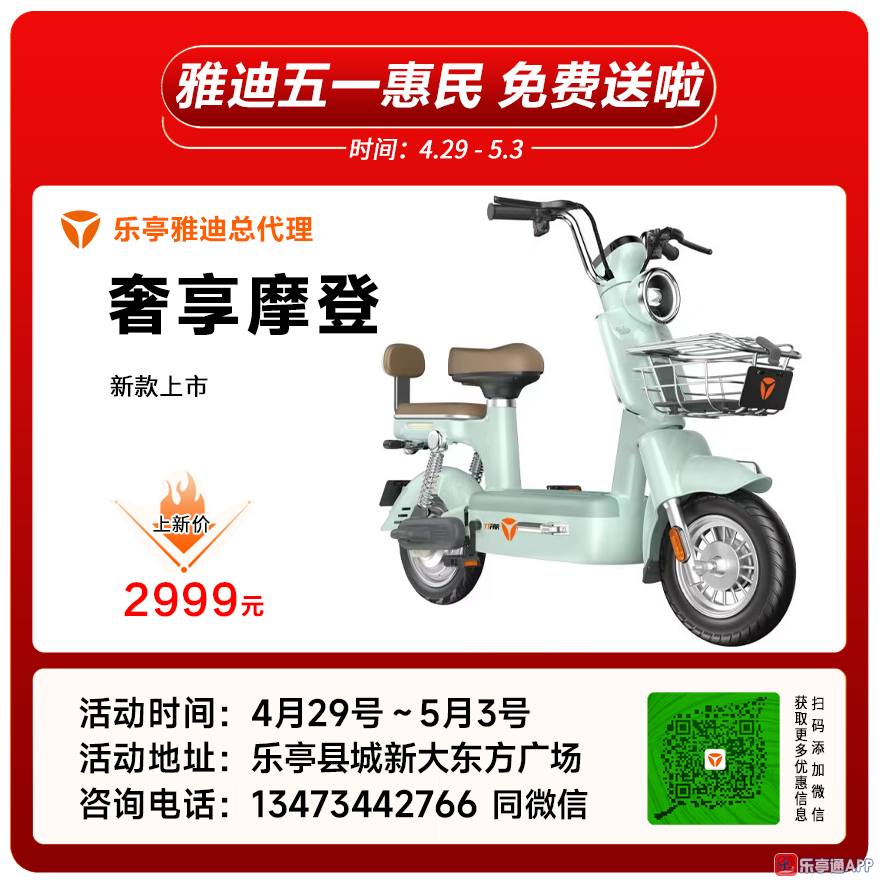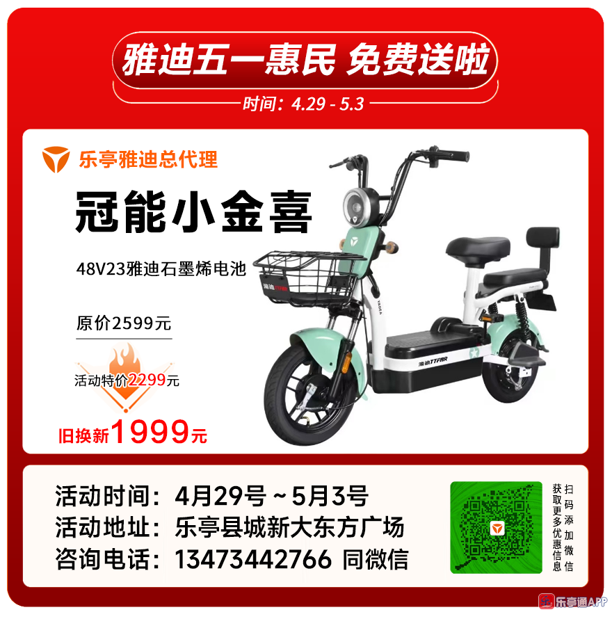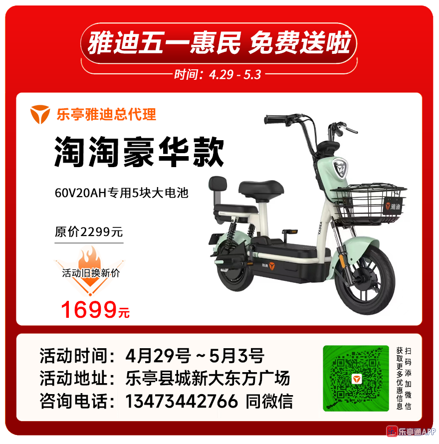 乐亭雅迪电动车五一惠民、全县各乡镇雅迪专卖店同步行动,雅迪免费送啦