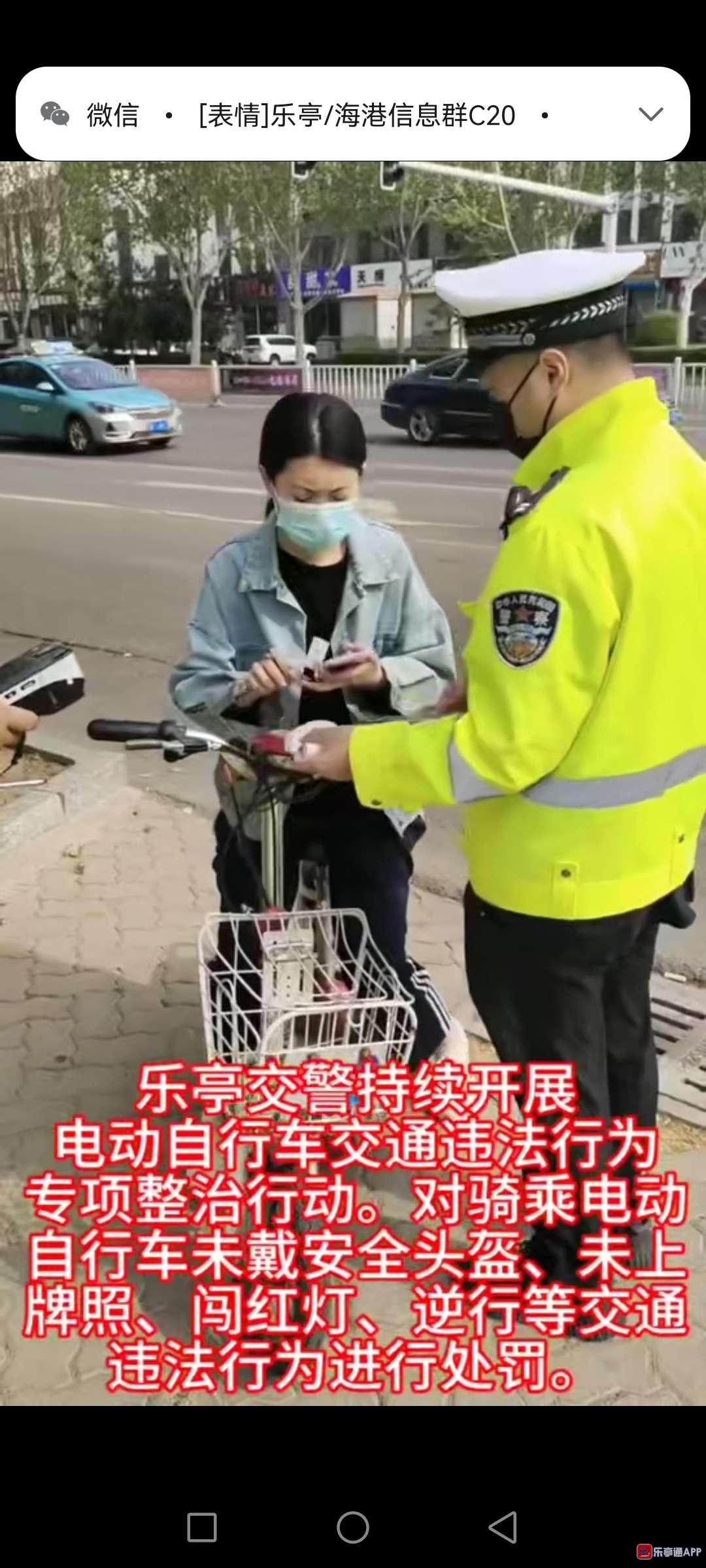 乐亭交警持续开展电动自行车交通违法行为专项整治行动。对骑乘电动自行车未戴安全头盔、未上牌照、闯红灯、逆行等交通违法行为进行处罚。
