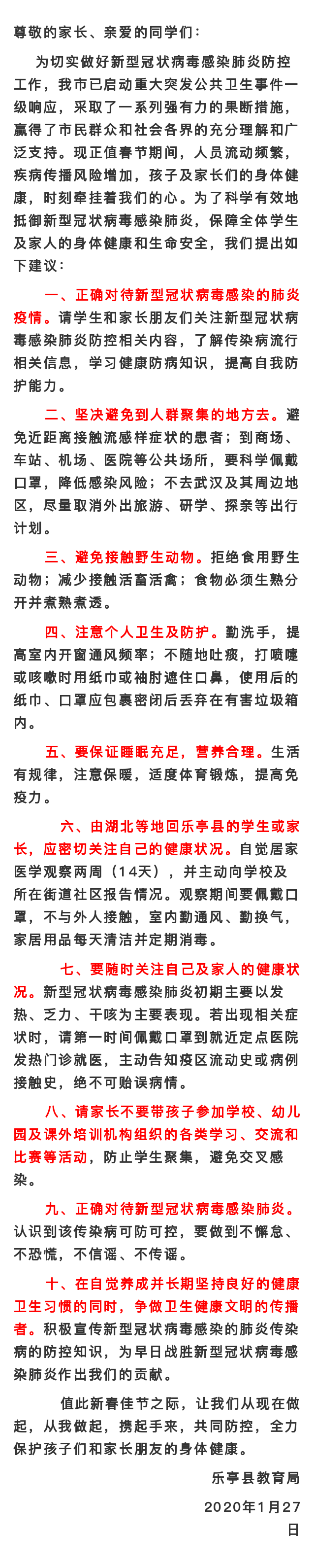 【众志成城】乐亭学生及家长防控新型冠状病毒应注意啥?