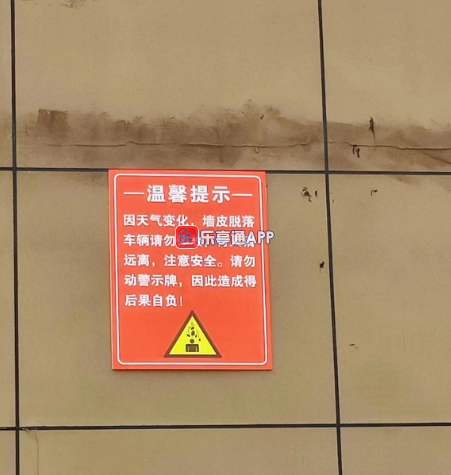 小区墙皮脱落,大家注意车辆不要停放,行人远离,注意安全