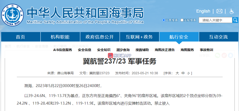 渤海,2023年5月22日0000时至26日2400时, 以39-24.6N、119-13.7E为基点,正东方向至正南偏西6°、夹角96°的扇形区域。该扇形区域的2个顶点坐标分别为39-24.2N 、119-28.4E和39-13.2N 、119-11.9E。该扇形区域内进行实弹射击活动。禁止驶入