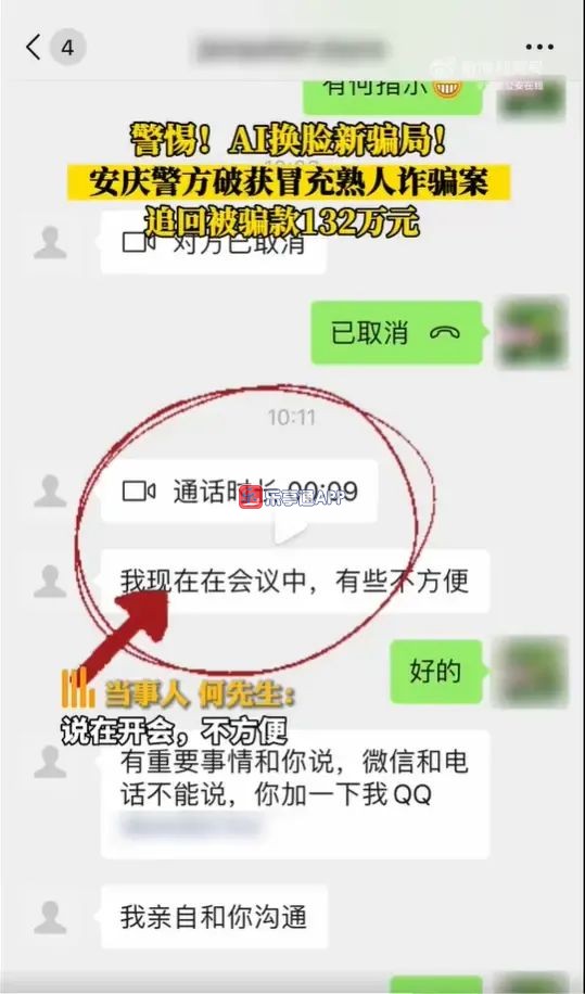 “视频里边我看到是他的脸”,“但是没几秒就挂了,说在开会不方便”。4月27日,何先生的微信“好友”突然向其发起视频通话,电话接通后,何先生看到“好友”正在一间会议室内,就在他准备进一步询问时,“好友”直接挂断了电话,并表示在会议中有重要事情交代,需要何先生添加QQ沟通。