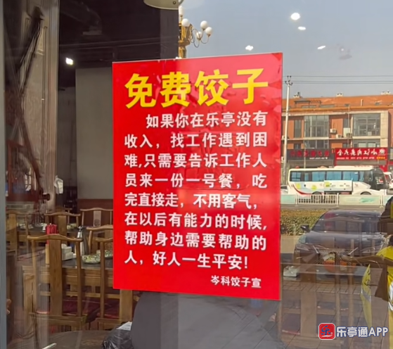 老板说:“免费饺子的告示店里贴出来很久了,怕被喷是作秀所以从来没在平台发过,但我们是真心实意想帮助人,因为被光救赎过,所以也想成为光!如果在乐亭你遇到困难,来找我就行了,别的帮不上忙,一顿饱饭还是没问题的”!