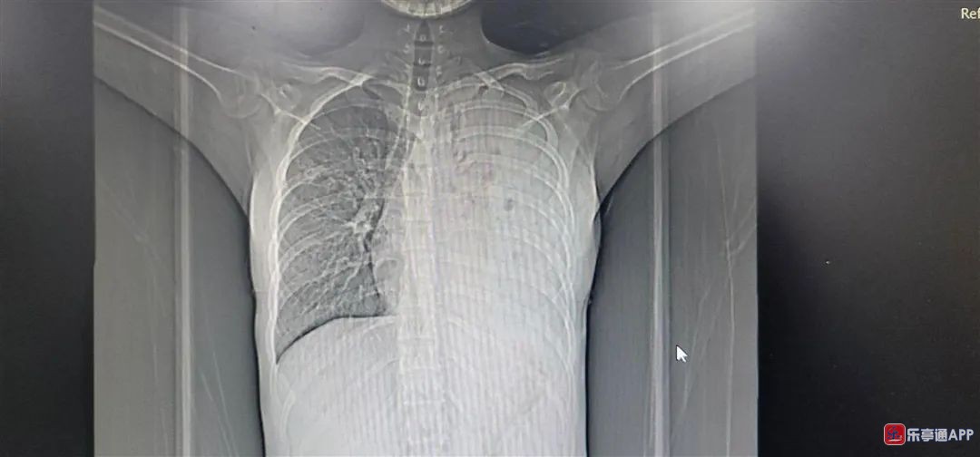 CT影像中,左肺已经消失(右侧是左肺,CT影像是镜像)