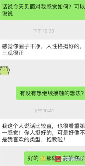 昨天和相亲对象见了面,中午给他发了消息,聊了几句我想试探一下他对我的感觉,然后他就一下午不吭声了。晚上忍不住问了他,就有了以上对话。他是个家庭条件比较好,自身能力也比较强,而我是个家庭非常一般的女生,除了长得好看点,其他的样样比不上人家。不管喜不喜欢,被人拒绝总是难过的。