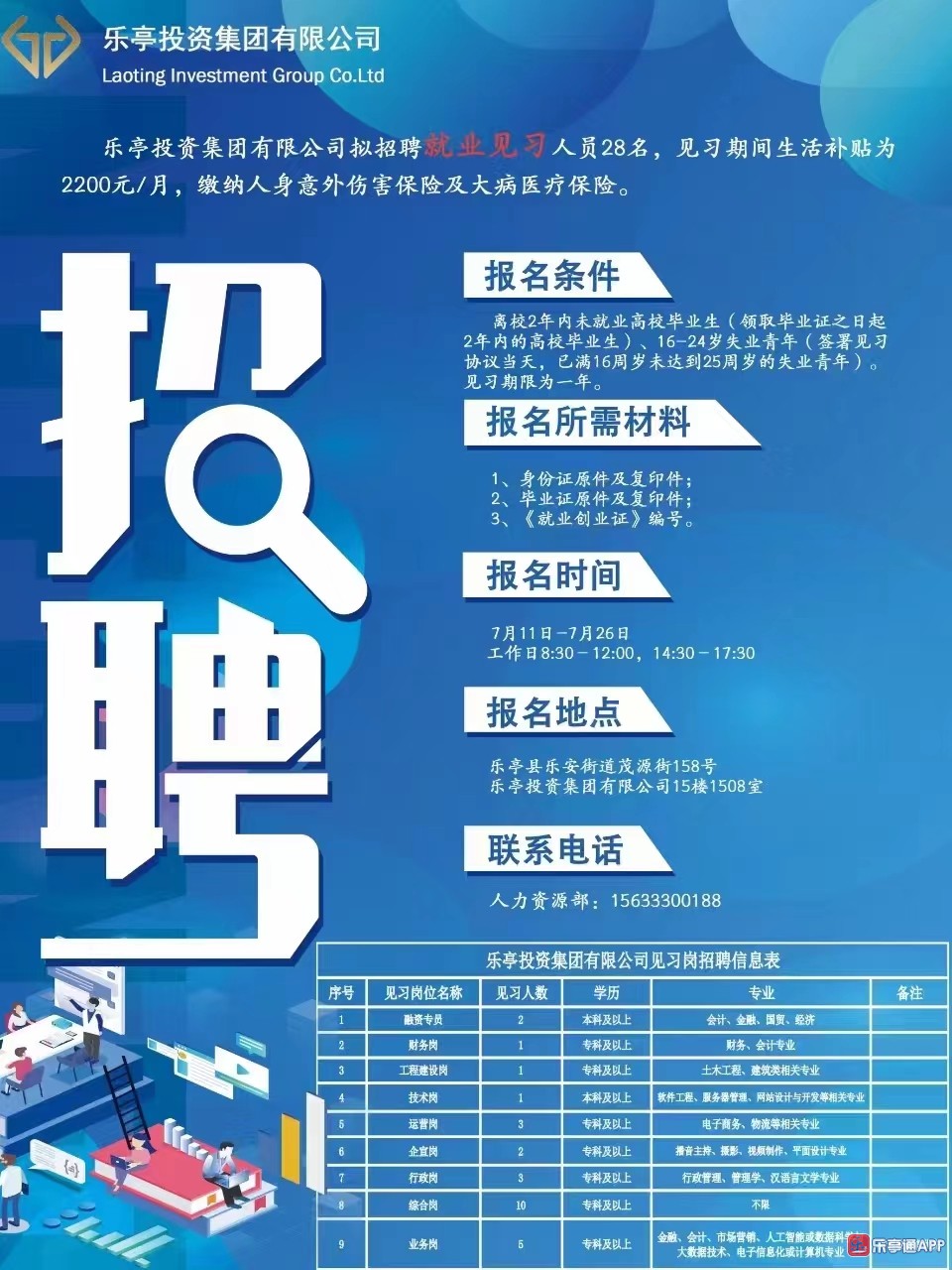 招聘28人!乐亭投资集团招聘就业见习人员!