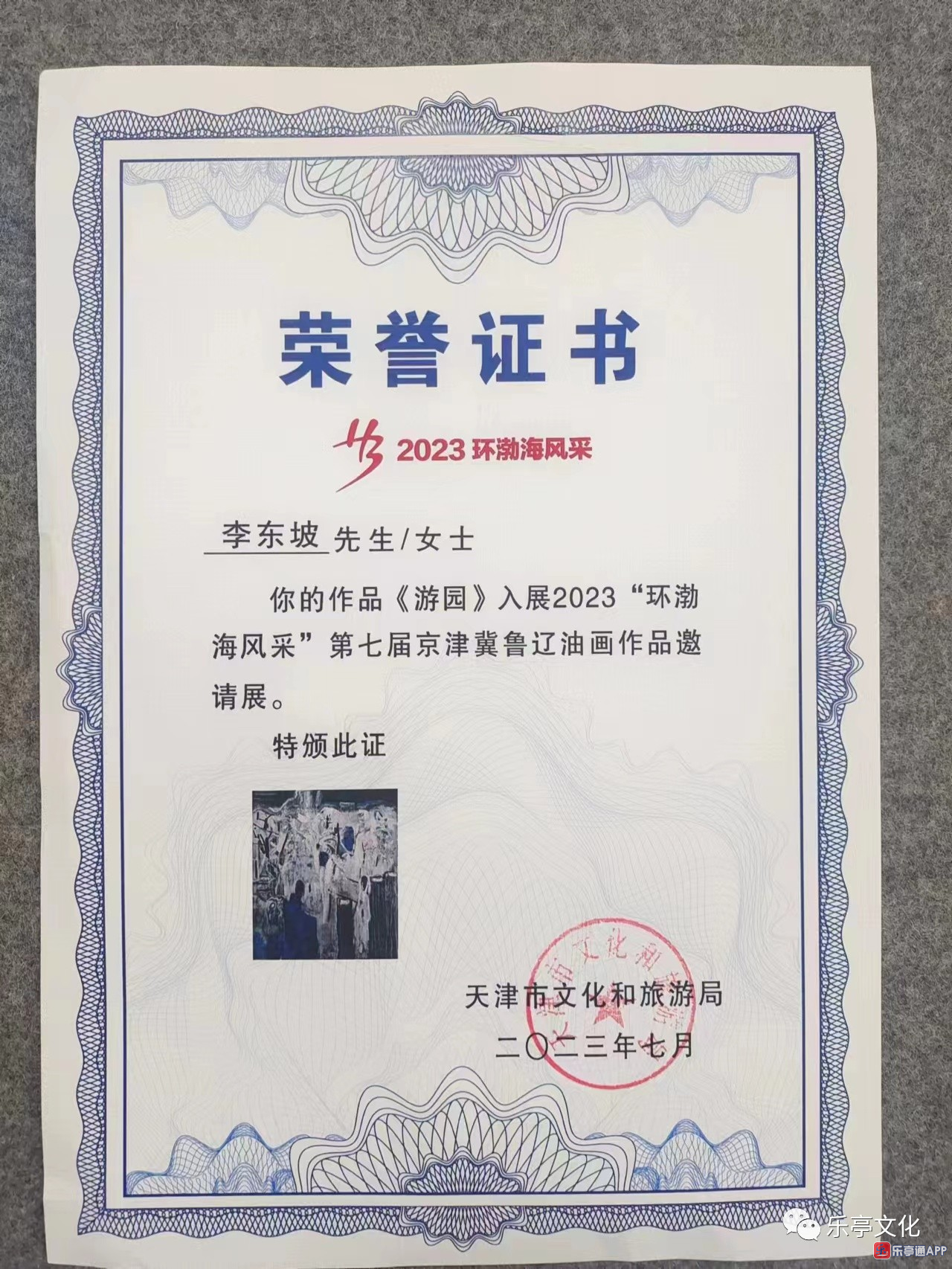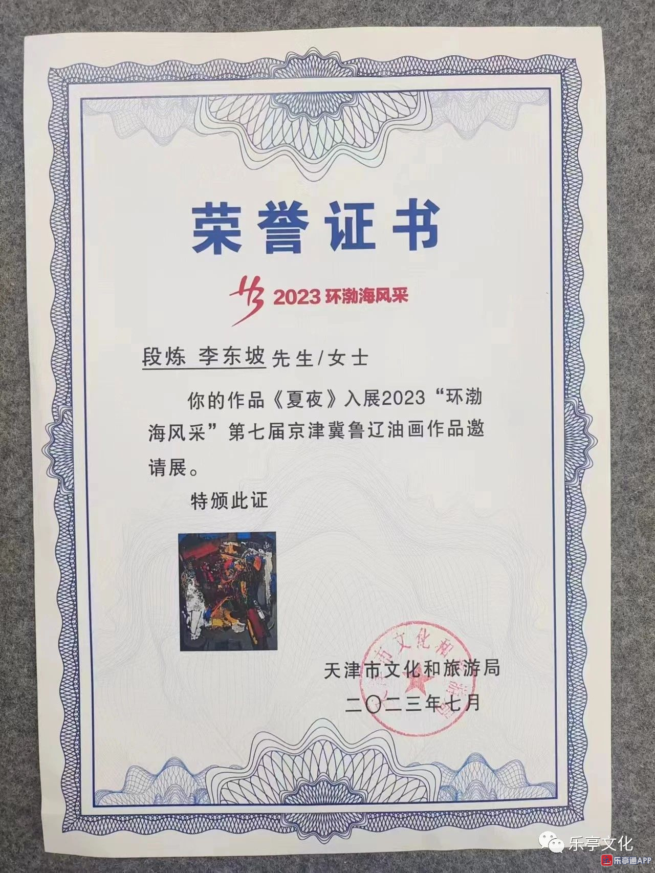 由天津市文化和旅游局主办,天津市群众艺术馆、北京市文化馆,河北省群众艺术馆(河北省非物质文化遗产保护中心),山东省文化馆,辽宁省文化馆(辽宁省青年宫)联合承办,天津彩林艺作美术馆协办的2023“环渤海风采”第七届京津冀鲁辽油画作品邀请展于7月4日在天津美术馆开幕,乐亭2件油画作品入展,并将在五地巡展。