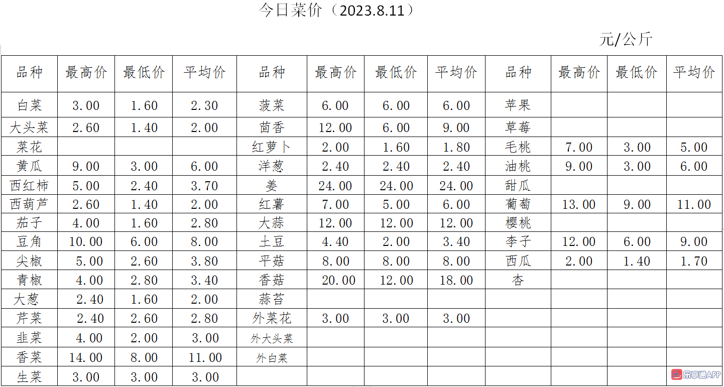 行情走势(2023.8.11) 立秋过后,市场内蔬菜入市量明显增多,价格整体稳定,果品交易持续走强。 蔬菜类:茄子价格经过昨天的大跌行情后,今天小幅反弹,最高批发价格4元/公斤,比昨天高0.4元/公斤,一般批发价格2.8元/公斤。芹菜价格下降,最高批发价格2.4元/公斤,比昨天低0.6元/公斤,优质铁杆芹菜上市量不大下,市速度较快。香菜价格继续上涨行情,最高批发价格14元/公斤,比昨天又上涨了2元/公斤,品质好,下市快。外地产红薯入市量大增,价格下滑,今天最高批发价格7元/公斤,比前几天低2元/公斤,蜜薯入市量最大,深得消费者喜爱。其他品种蔬菜价格保持稳定状态。 果品类:西瓜价格继续下跌走势,最高批发价格2元/公斤,比昨天又下降了0.2元/公斤,一般批发价格1.7元/公斤。葡萄交易量位居果品类第二,最高批发价格13元/公斤,价格稳定,供应量充足。毛桃、李子等价格波动不大,供需平衡。
