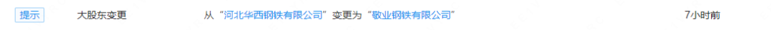 从“河北华西钢铁有限公司”(退出前持股100%)变更为“敬业钢铁有限公司”(持股100%)
