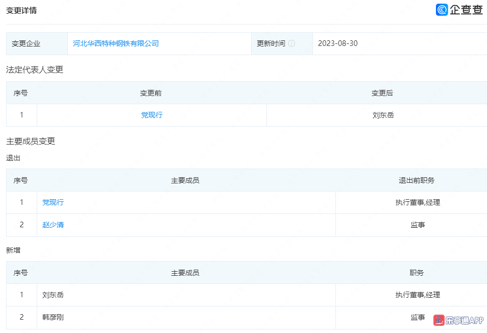 据企查查8月30日最新消息显示,河北华西特种钢铁有限公司大股东、法定代表人和主要成员发生了变更: