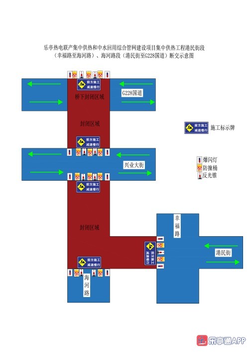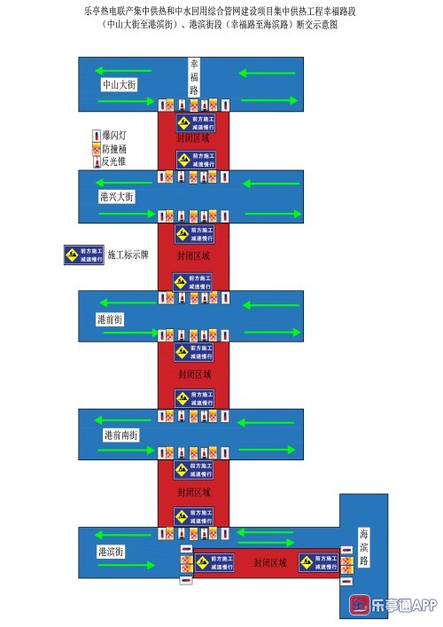由于乐亭热电联产集中供热和中水回用综合管网建设项目集中供热工程需要,经唐山市公安交通警察支队第七交通警察大队批准,为保证施工作业面及过往行人、车辆安全,对港滨街、幸福路、港民街、海河路,采取优先断交施工。