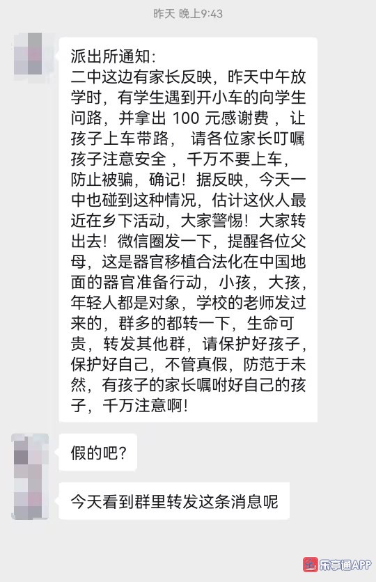 近日,乐亭的微信群里传开了一条紧急通知:“现有二中家长反映:昨天中午放学时,有学生遇到开小车的向学生问路 ,并拿出100元感谢费 ,让孩子上车带路 ……”的消息,更是有一些家长担忧,给小编发消息问是否属实,在此提醒大家