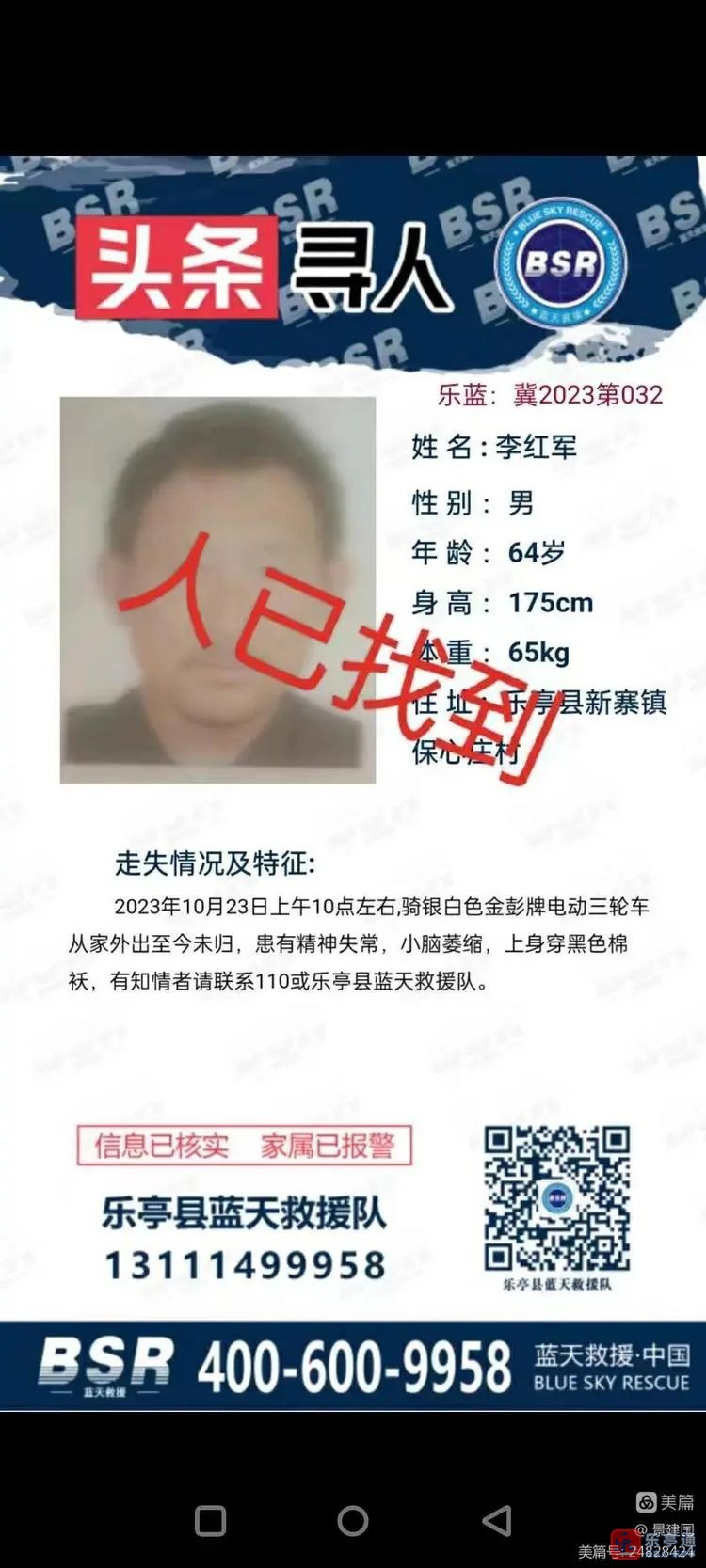 于10月23日骑电三轮走失