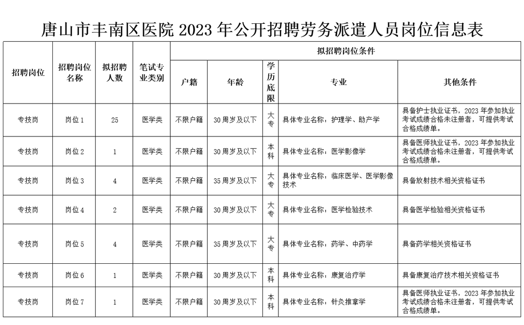 1、面向社会招聘35周岁以下(1989年10月31日以后出生)专科及以上普通高等院校医学类专业毕业生,具备相应岗位执业资格(2023年参加执业考试成绩合格未注册者,可提供考试合格成绩单)。